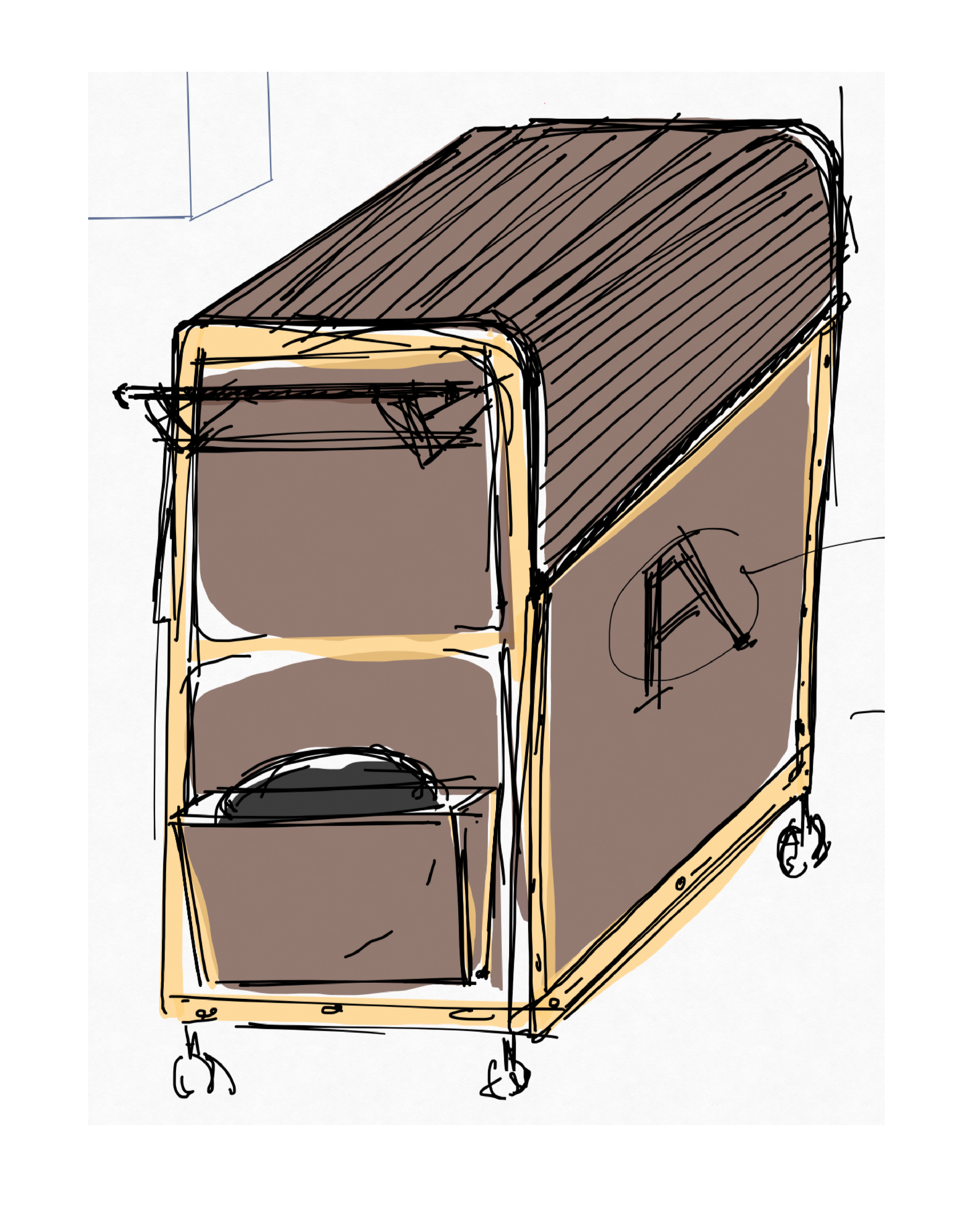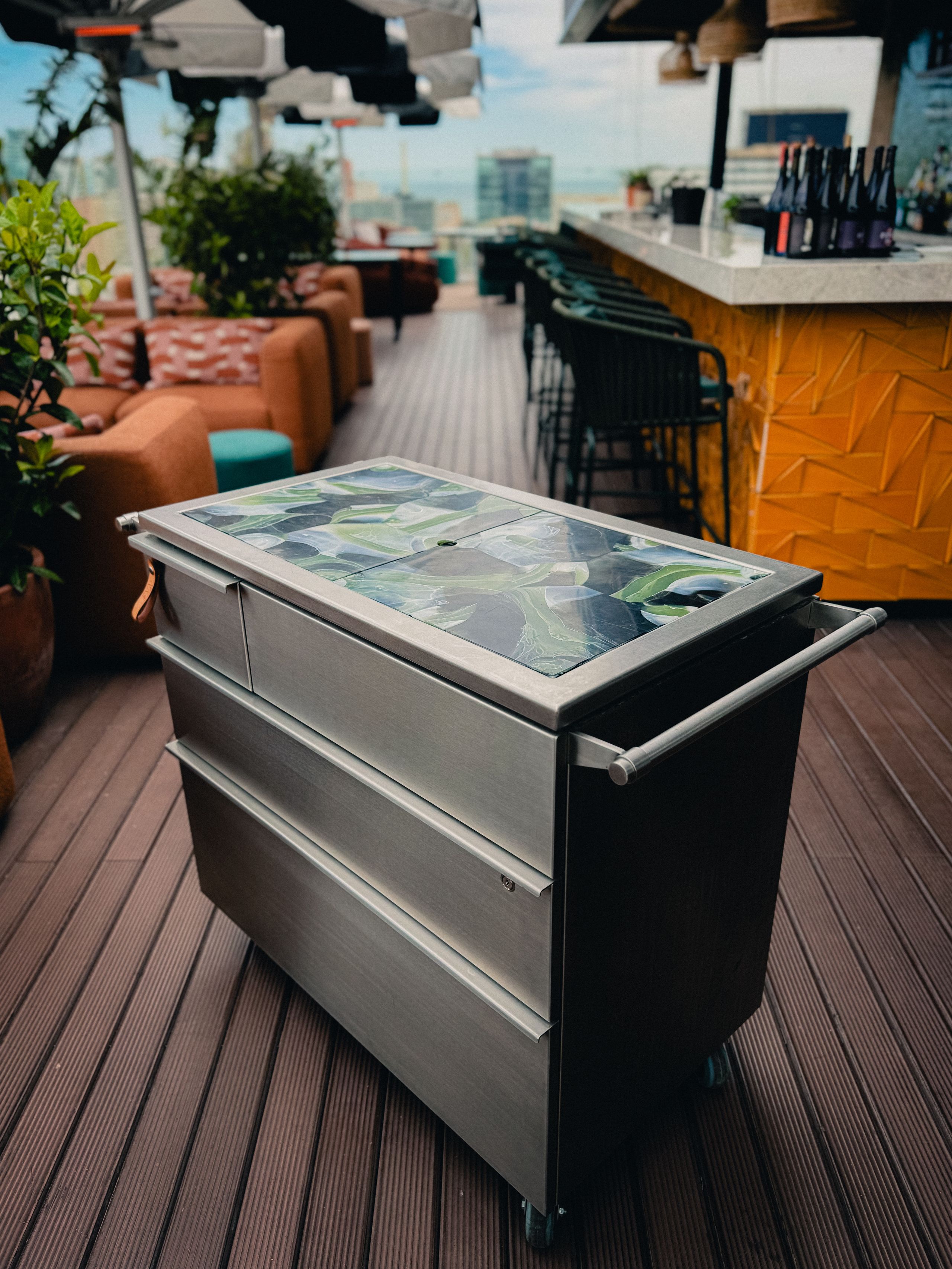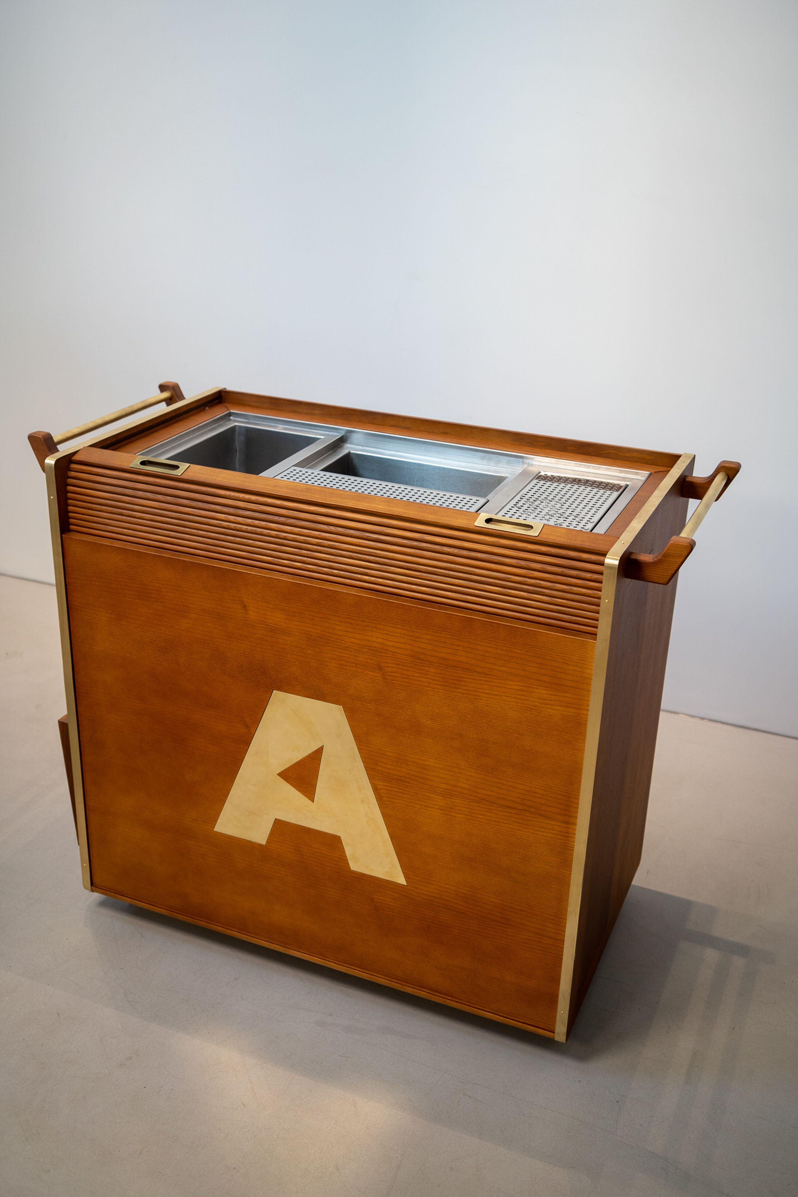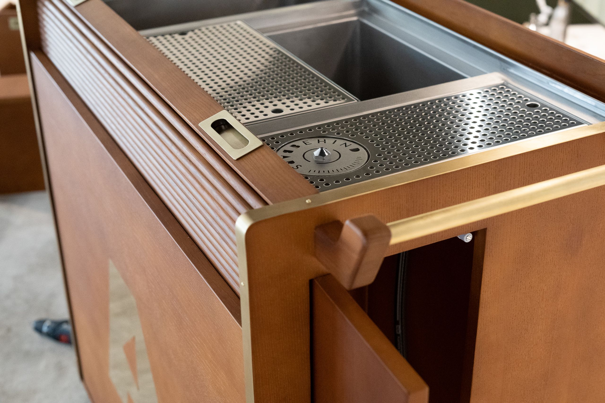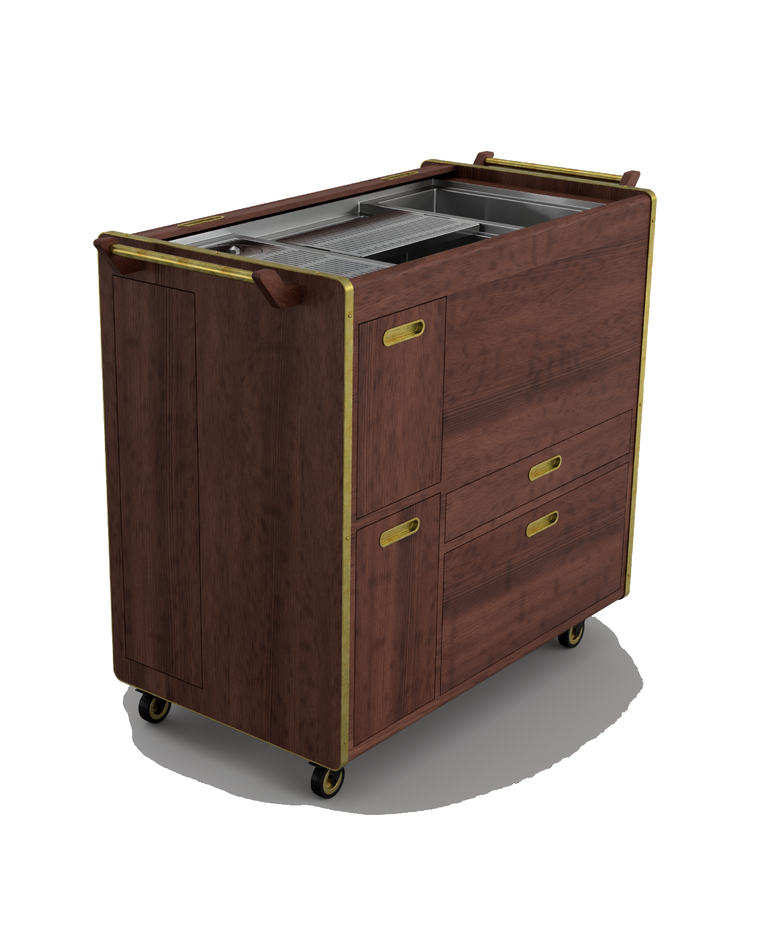 Amerikalinjen is a beautiful boutique hotel in the centre of Oslo. Their bar manager Slavomir Kytka approached us to design and build a custom drinks trolley meant for a special room service experience. The trolley needed to be fully functioning and able to produce a high standard cocktail menu, all while fulfilling a level of theatrical service for the guest. The working surface of the trolley is the stage, the drink making is the show, and the hand crafted tambour cover is the red curtain to signal the start and end of the experience.