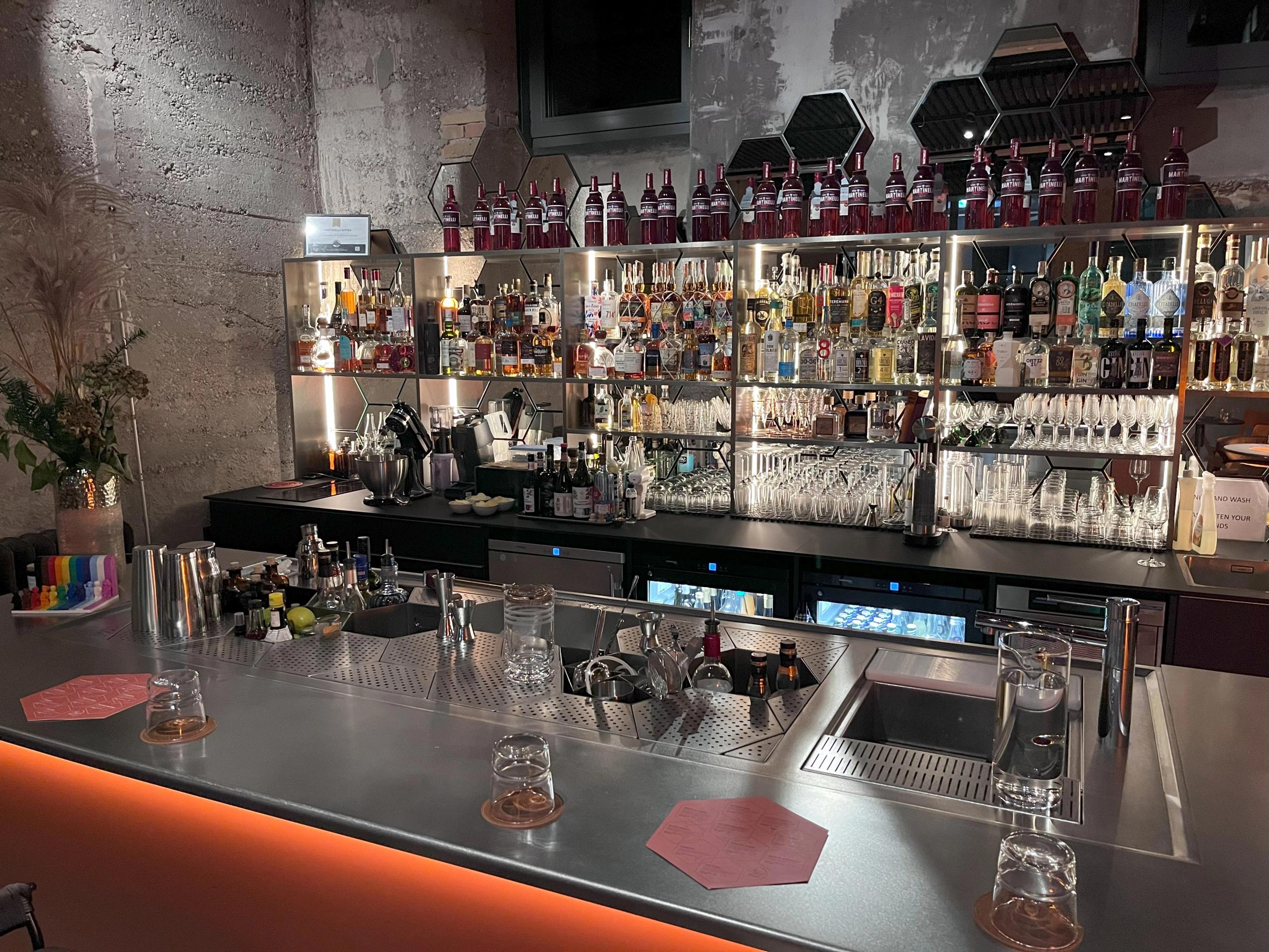 Located in the basement of the historic Betriebswerk building, Bar Martinelli is an owner-managed cocktail bar with 25 seats. The interior blends timeless furniture inspired by 1960s and 70s design with original sprayed concrete walls from 1920, which are preserved as part of the building’s protected structure.