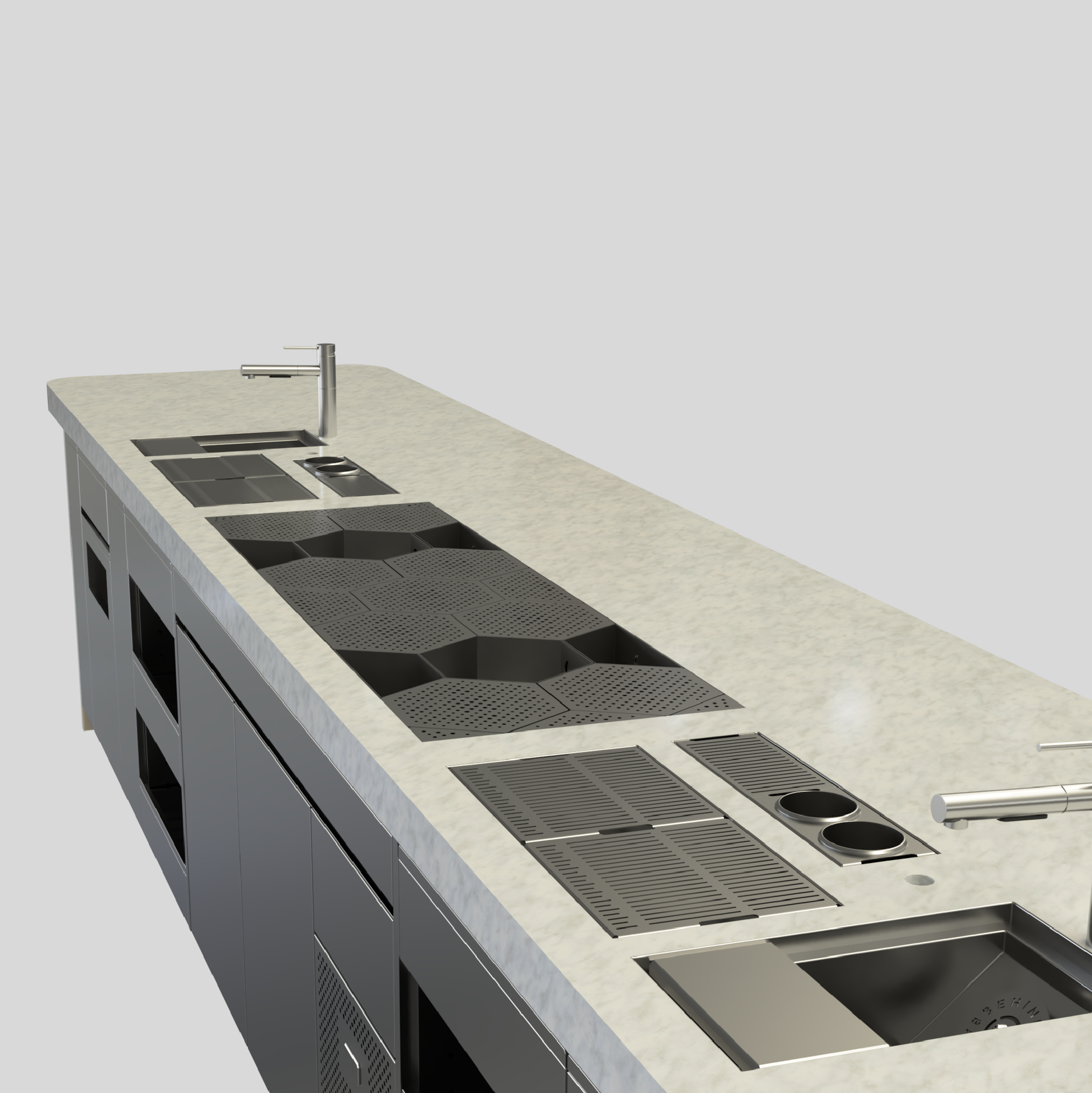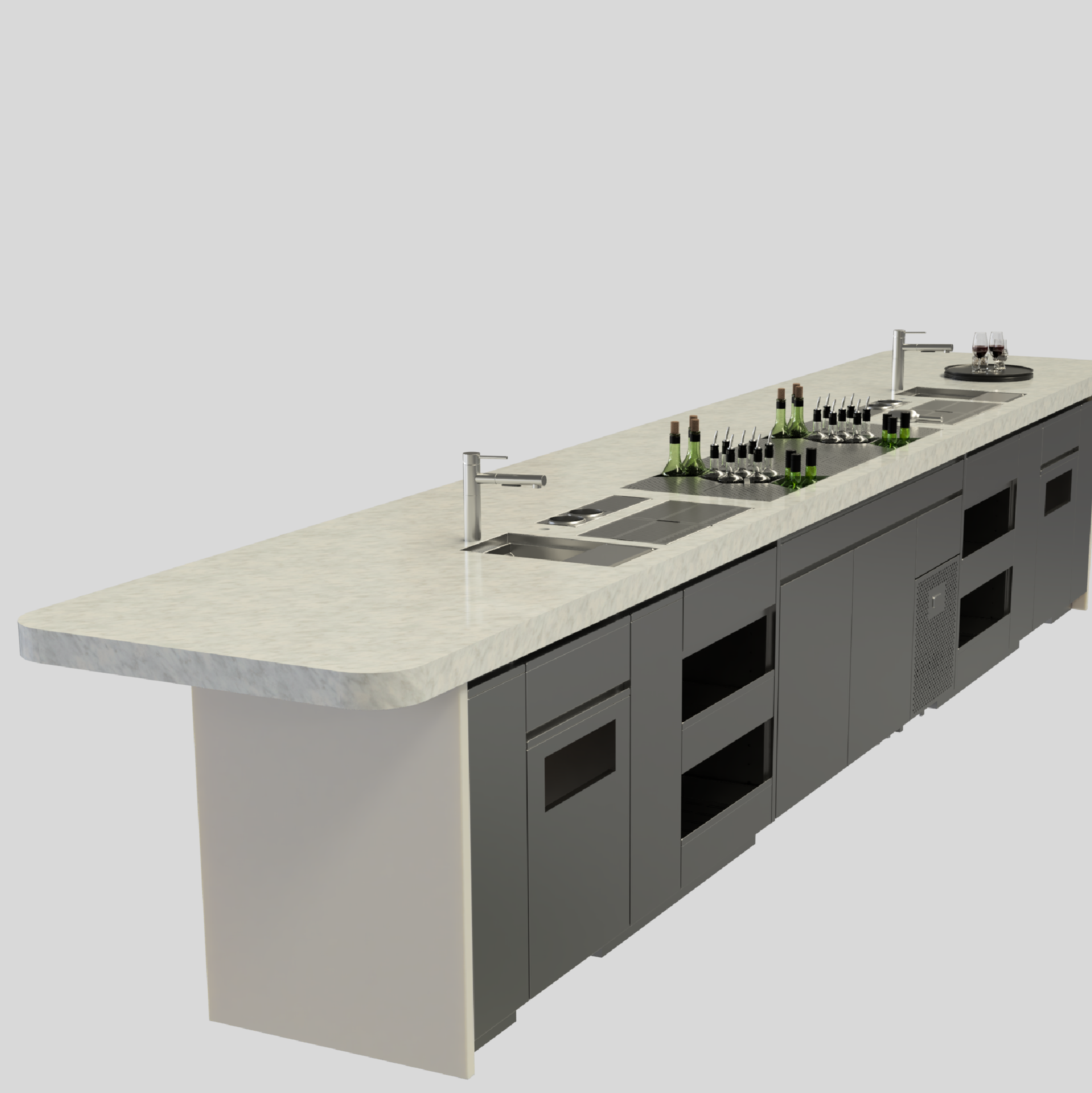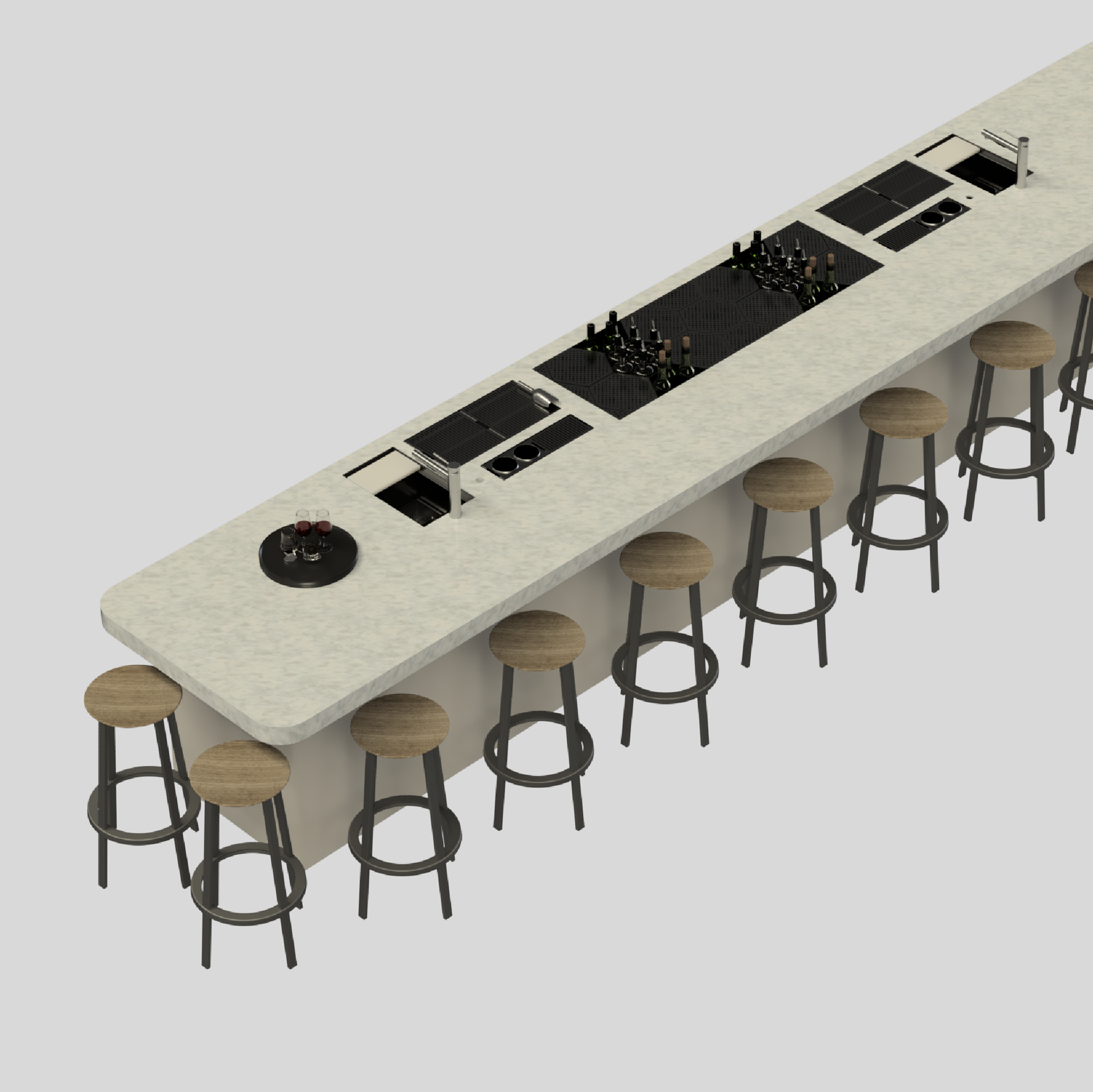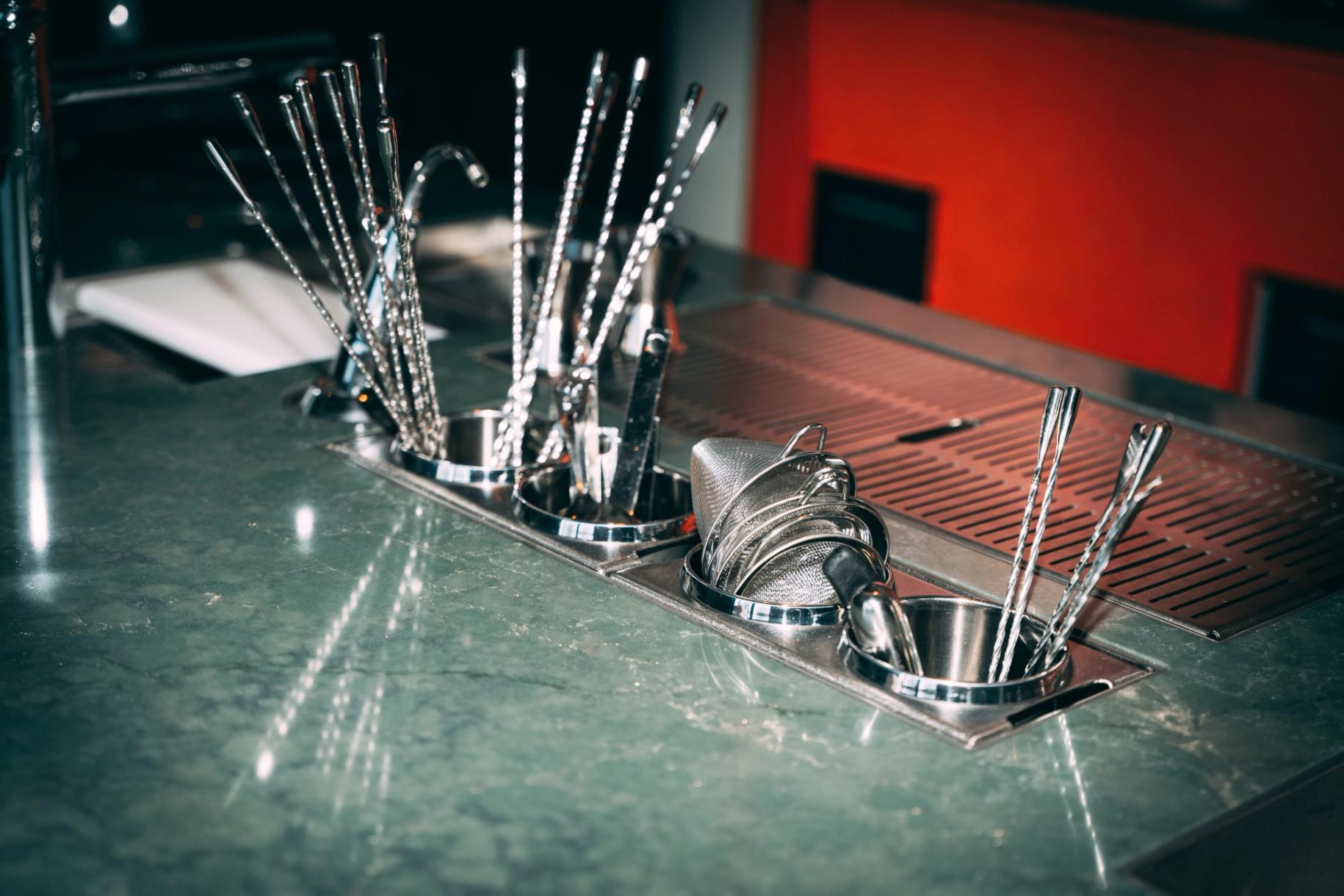 At the centre of Brother Louis sits a bespoke Tayēr station with an integrated stone flush countertop. Designed to support a cocktail heavy programme within a refined architectural setting, the station balances visual restraint with operational precision. Built for volume, collaboration and controlled movement, the layout ensures efficiency without compromising the calm presence of the bar.