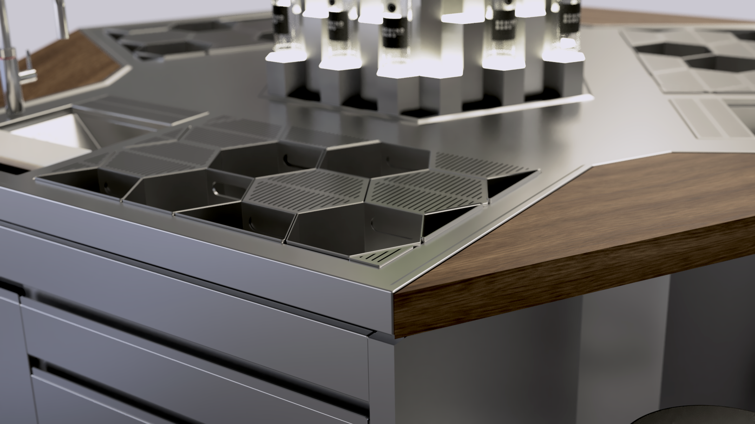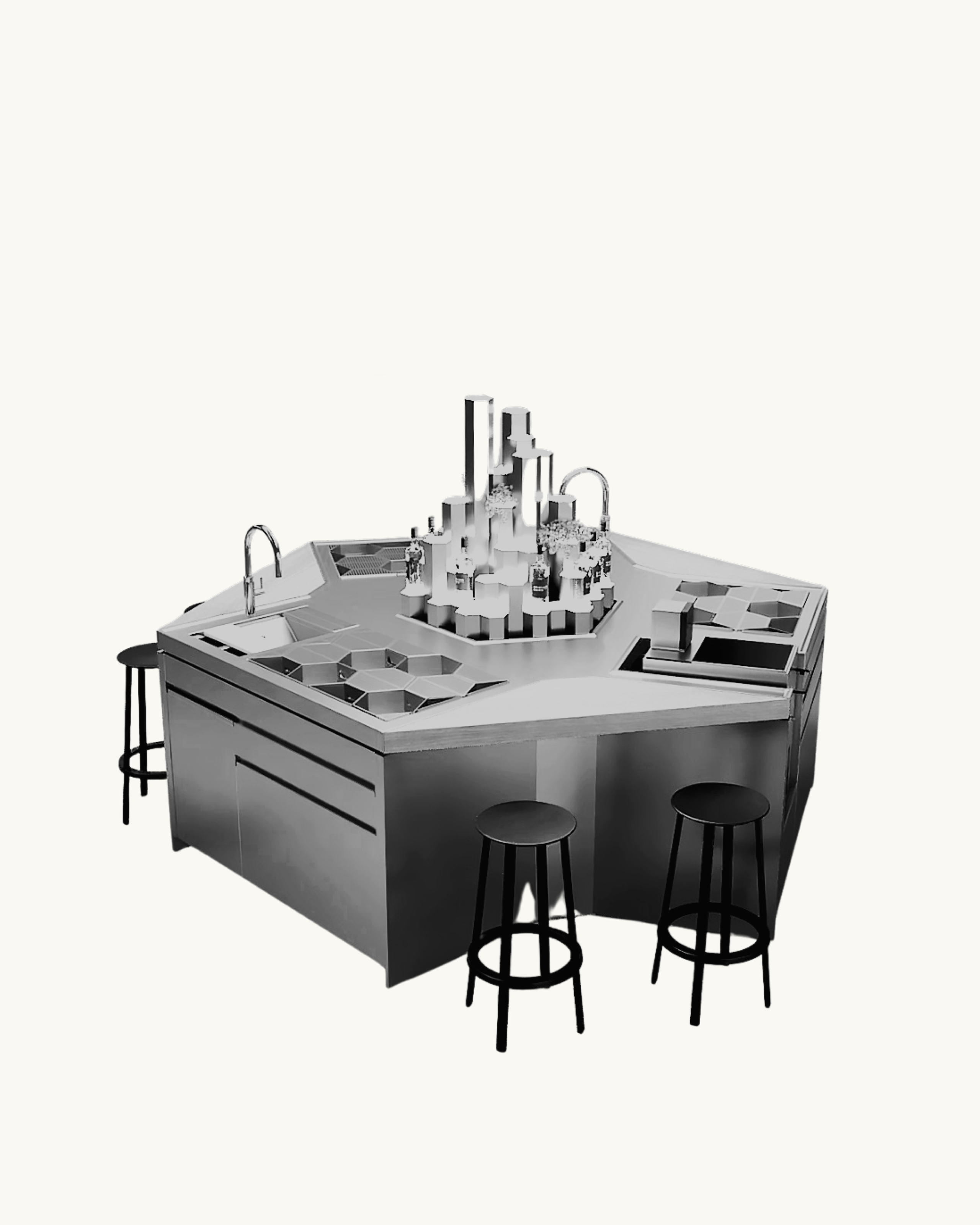 The three-station island at Insider Bar in Moscow is designed to bring guests 'Behind the Bar', or right next to the bartender. It was designed to create an interactive and sensory experience. The guests feel involved in the atmosphere of the evening, having a ringside view of skilled professionals executing their craft. The highly collaborative Behind Bars design process resulted in, not only a unique centerpiece that fits seamlessly into a broader visual concept, but also an unparalleled working station with the capabilities to execute a highly ambitious beverage concept.