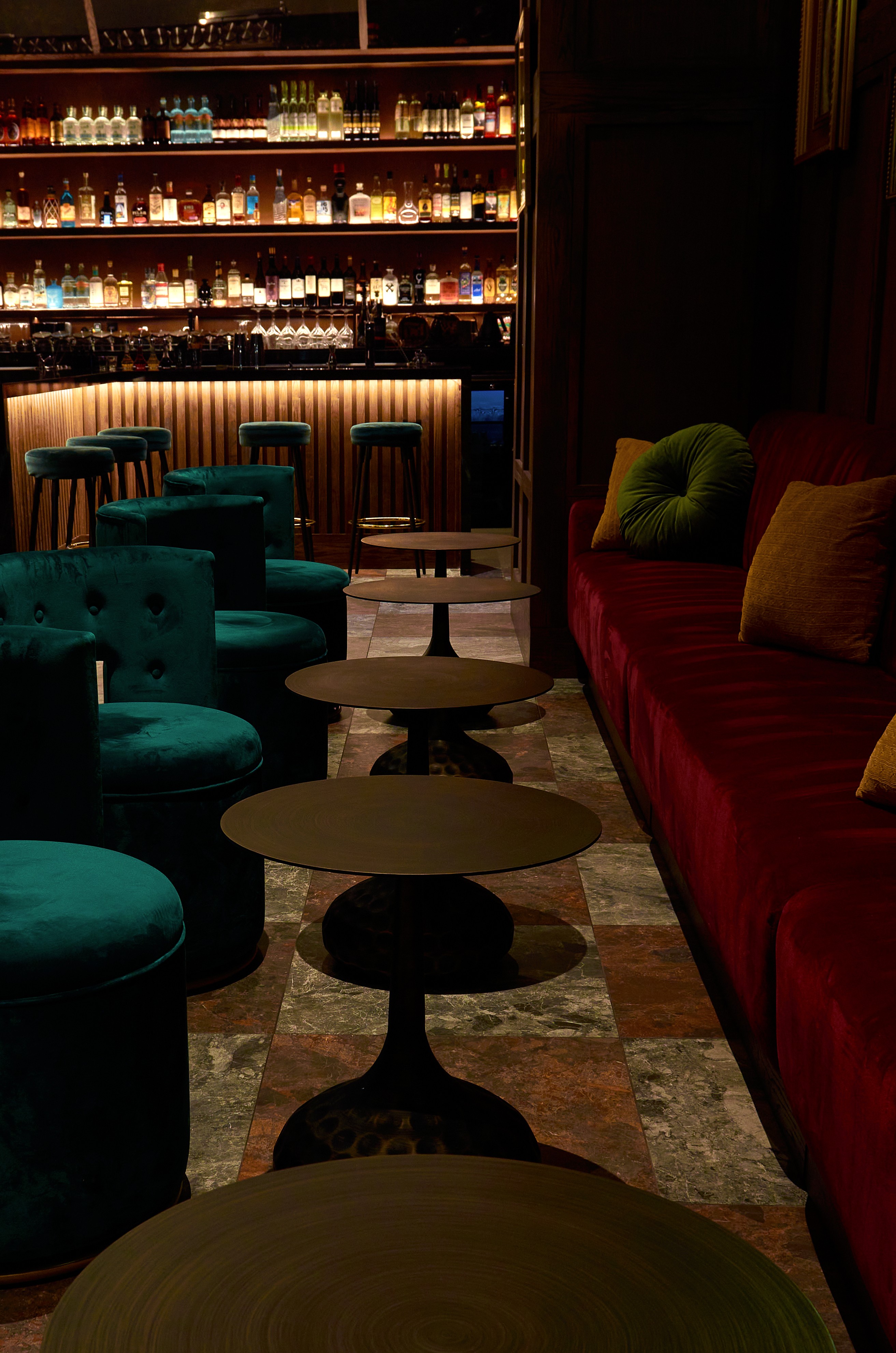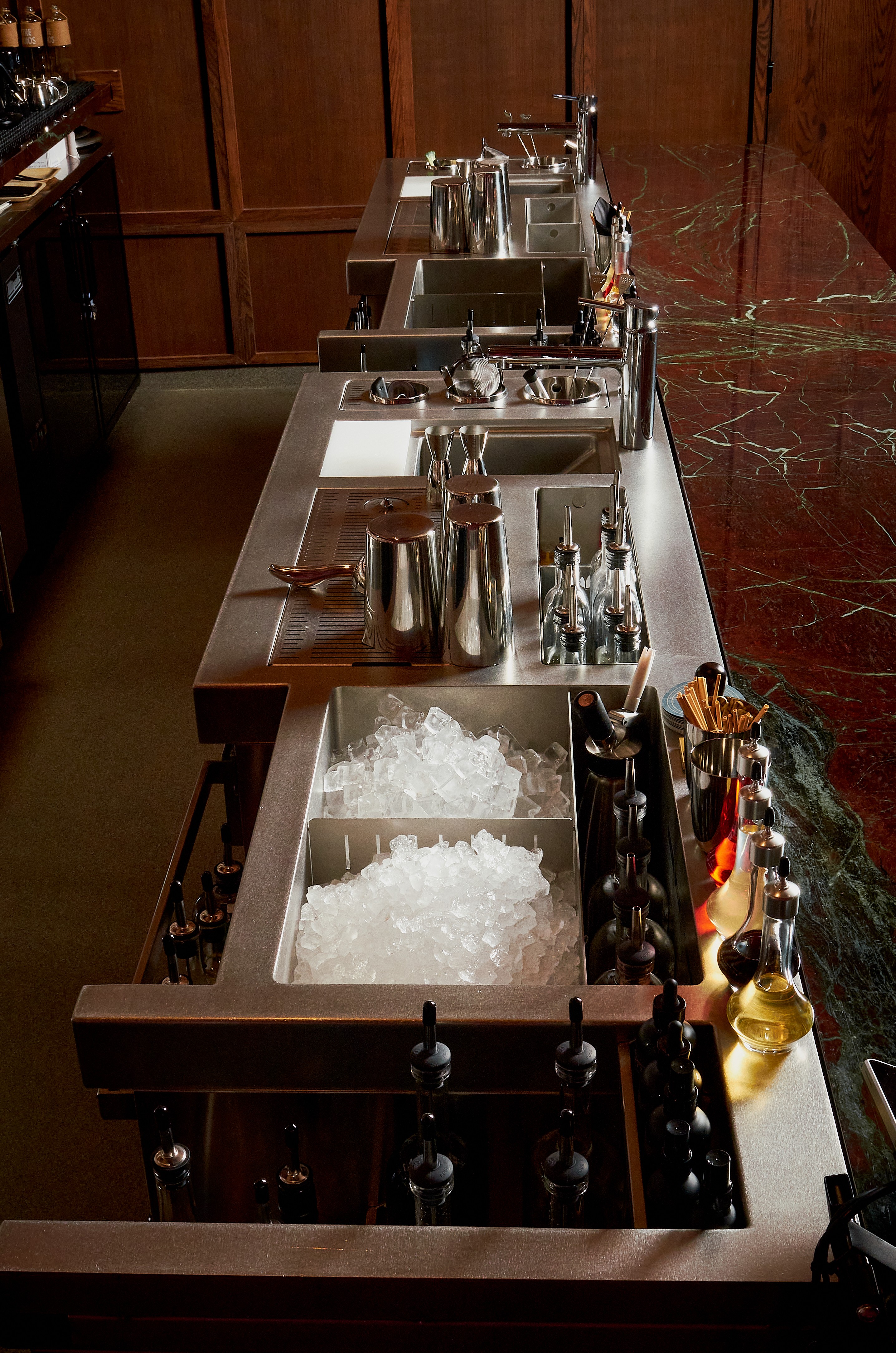 At the center is a custom double Paloma station, designed to match the rhythm of service and keep the creative process in view. The raised work height opens the space between bartender and guest, turning each service into a moment of performance and connection. Inspired by open-kitchen design, the layout highlights the craft and coordination behind every drink.