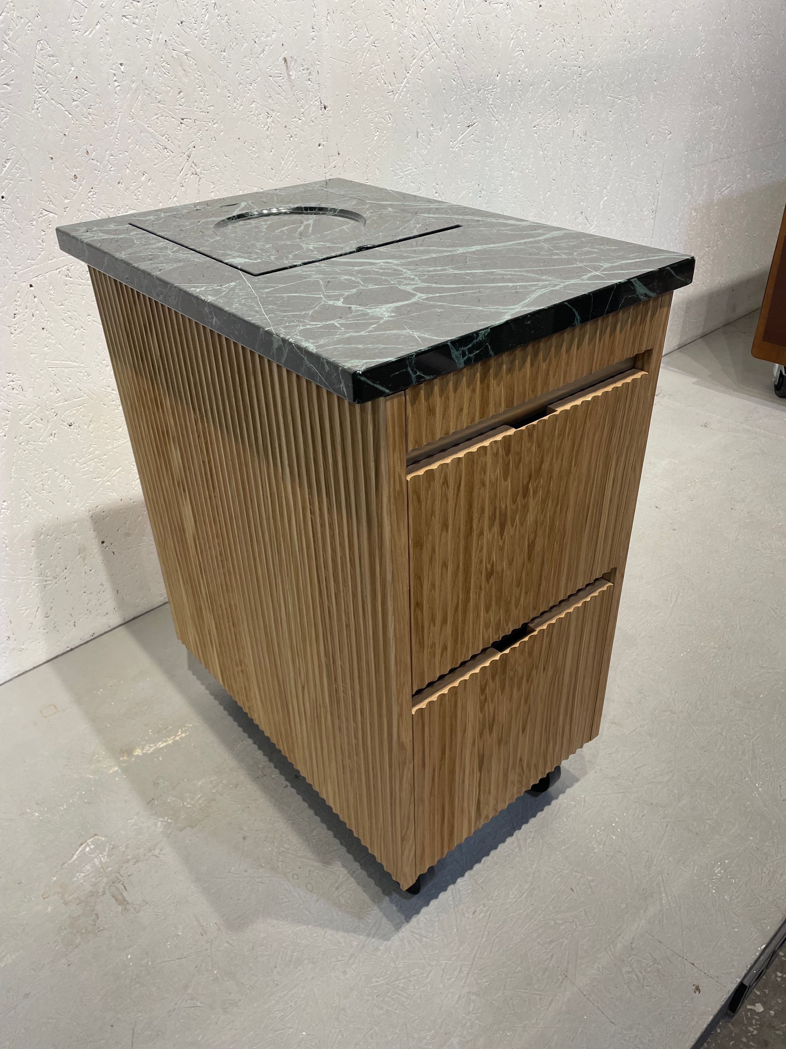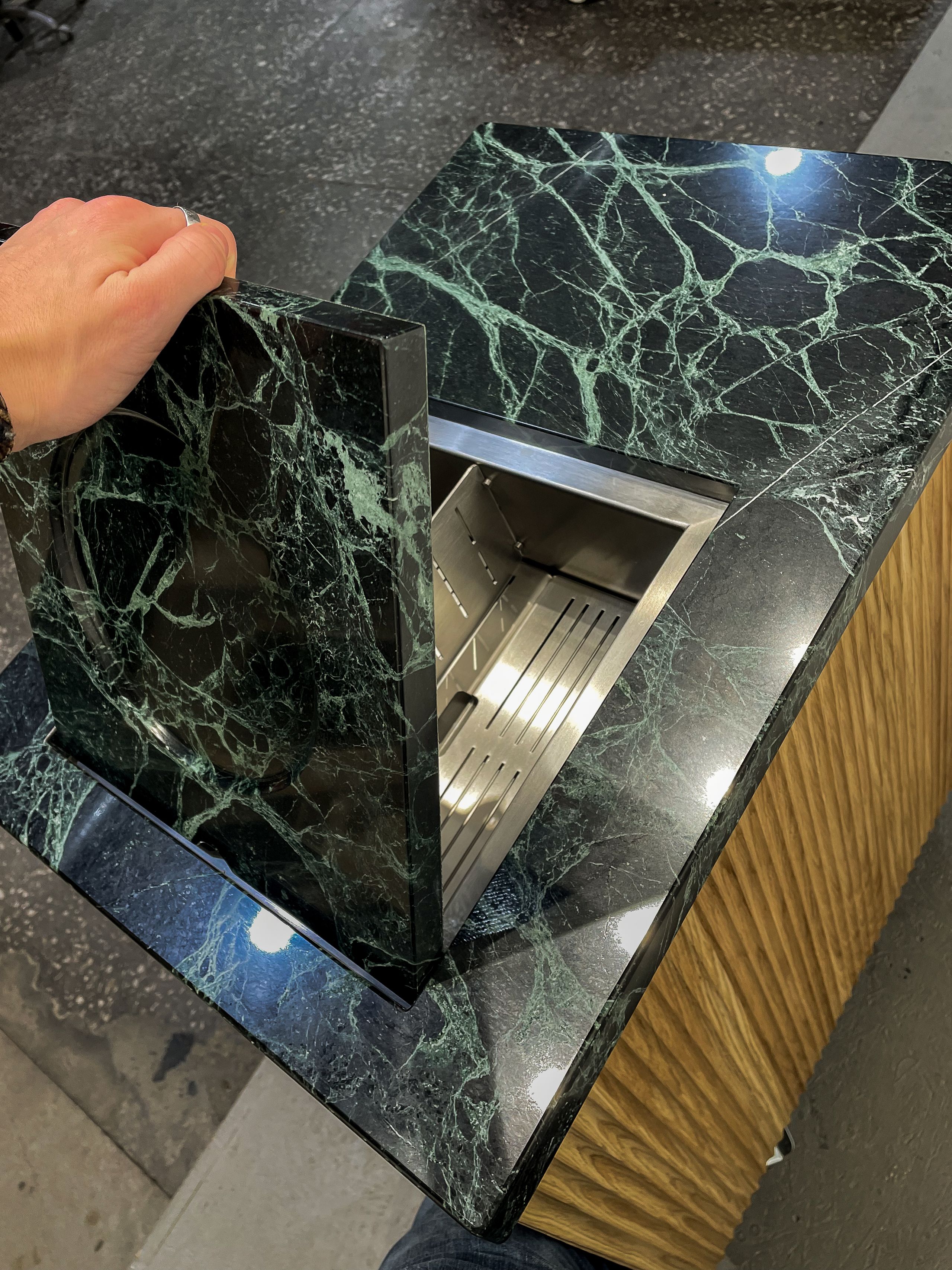 Clad with oak panels and adorned with a lush green stone top, the unit seamlessly integrates into the aesthetic of the Plah venue, complementing its lively atmosphere and attentive service.