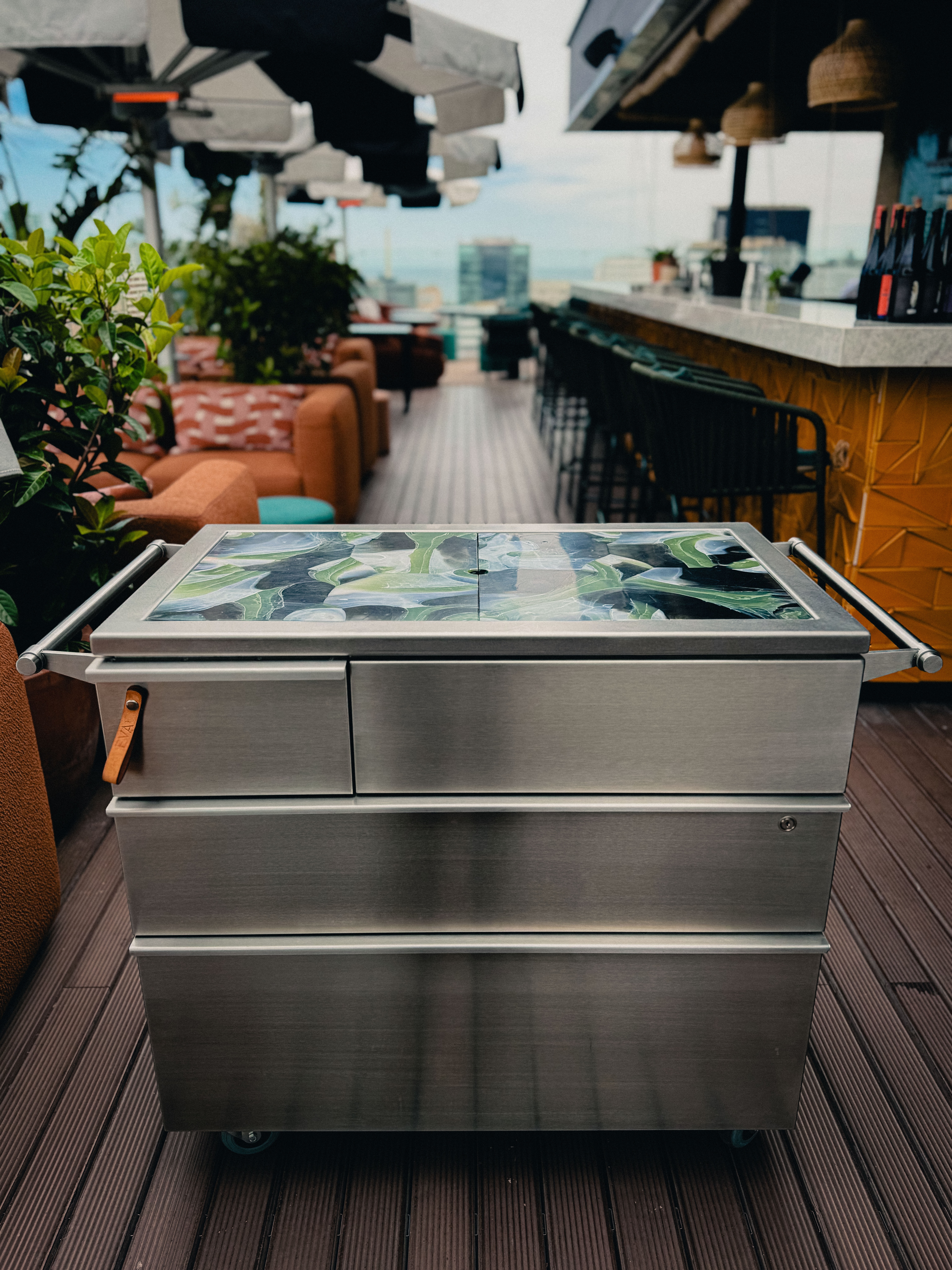 Rather than keeping everything behind the bar, the trolley allows parts of the preparation to move across the space. It works as a small, self-contained station, built in steel, that supports a more flexible way of serving without overcomplicating things.