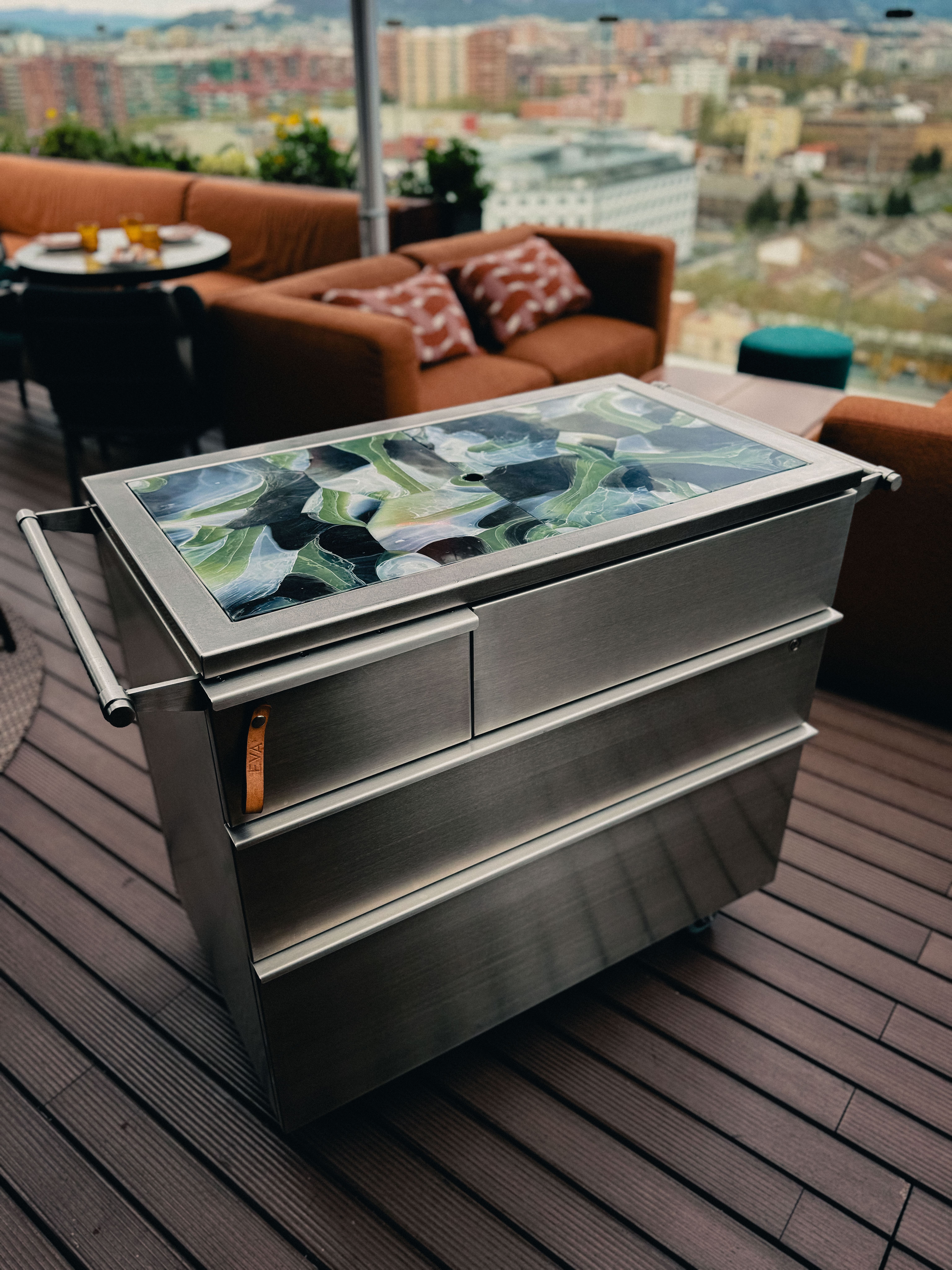 A collaboration in Barcelona, extending material thinking from coasters to the Eva trolley. Working with Weez & Merl, recycled plastic becomes both surface and statement, shaped through process and use.