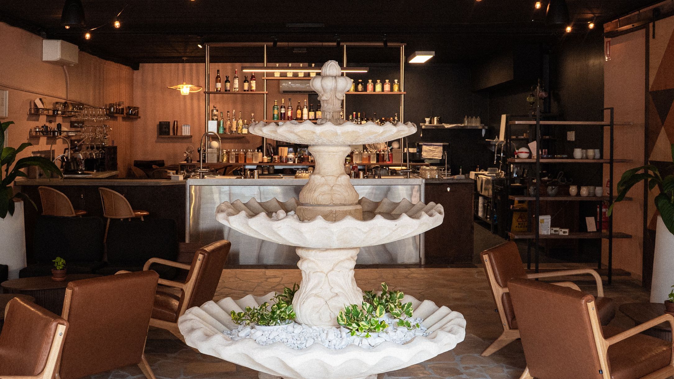 The space takes cues from a European piazza, with a central fountain anchoring the room and creating a natural point of gathering. Warm materials and an open layout bring the bar into the room, encouraging interaction rather than separation.