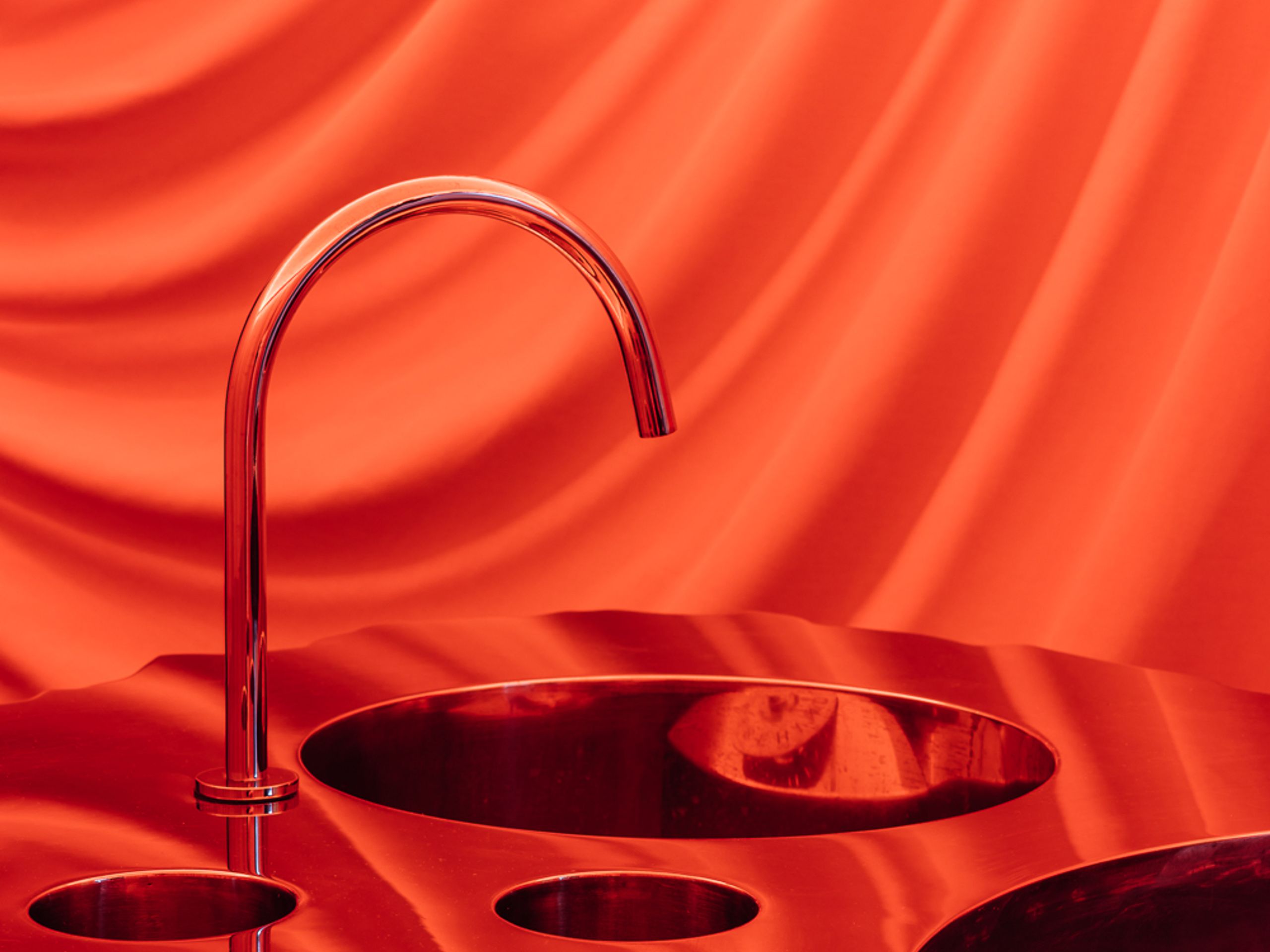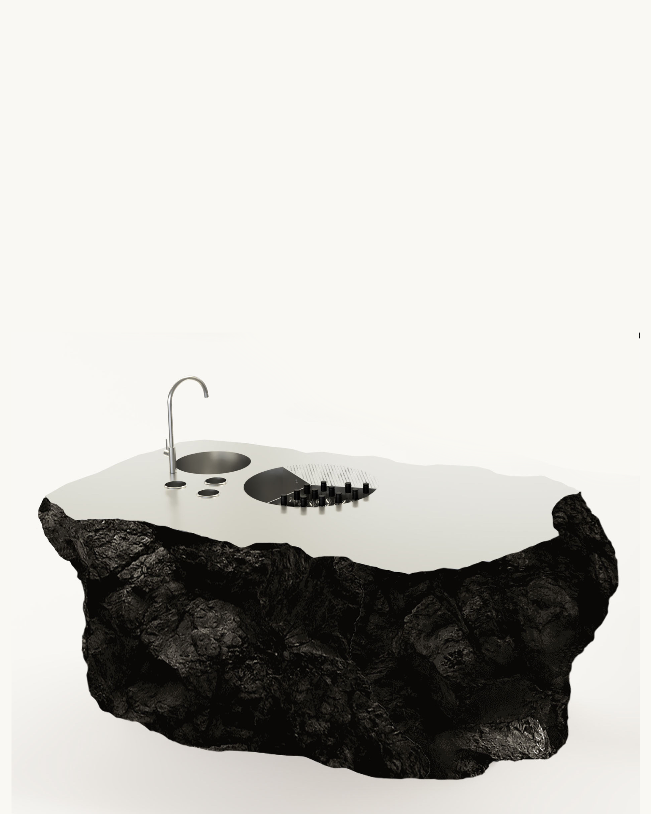 The station itself, sculpted from foam and rubber by Softrock, resembles a volcanic rock, cut horizontally to reveal its hollow interior. It sits in the center of a space defined by contrasts: raw and refined, natural and futuristic. Around it, the perimeter dissolves into a curtain that softens all boundaries. Above, a glowing canvas ceiling developed in collaboration with artist Manuel Tainha, gives the impression of diffuse daylight.