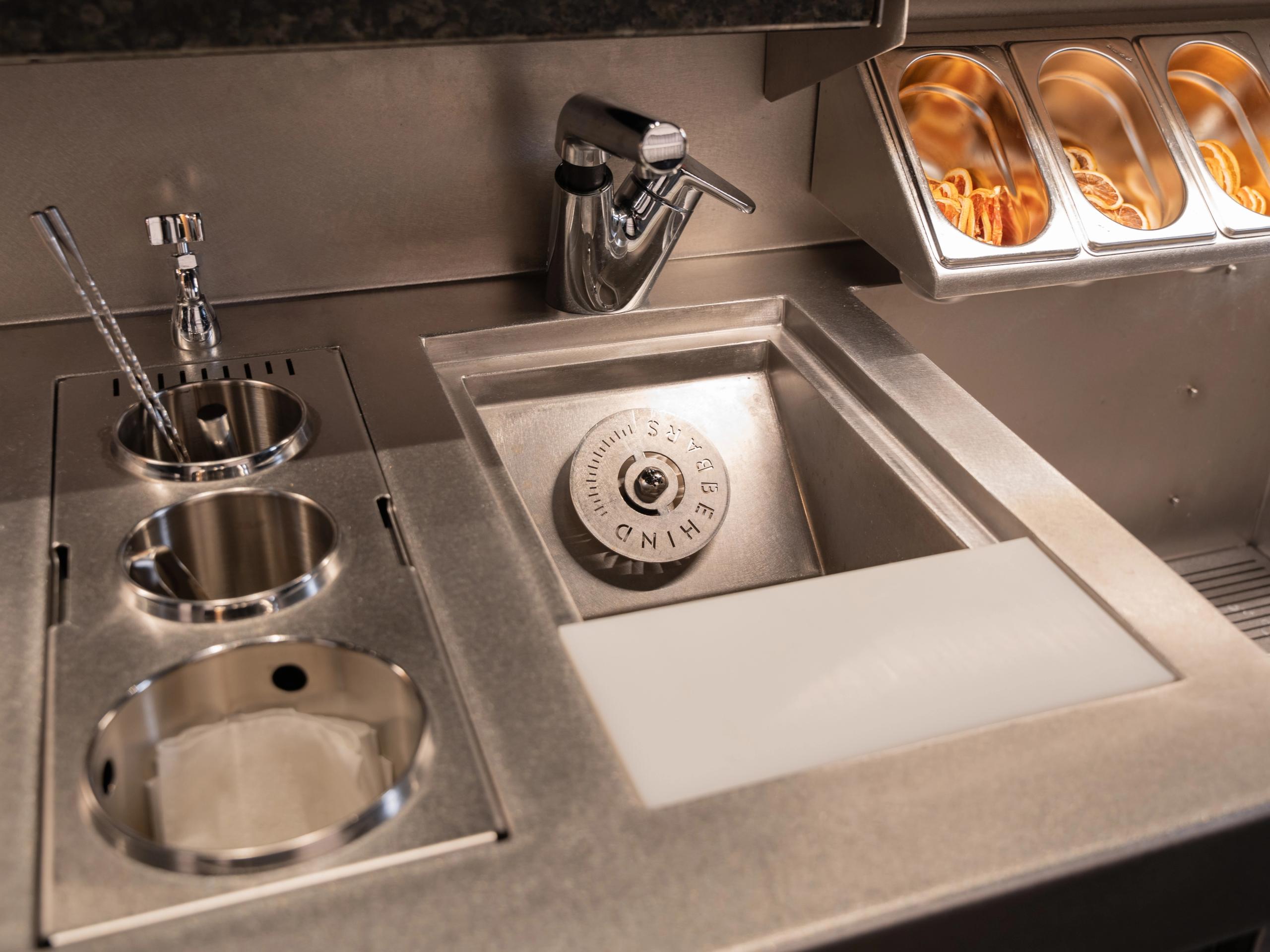 Integrated sinks and tool holders keep essentials like rinsers, bar spoons, and strainers within arm’s reach—supporting quick resets and clean workflow throughout service.