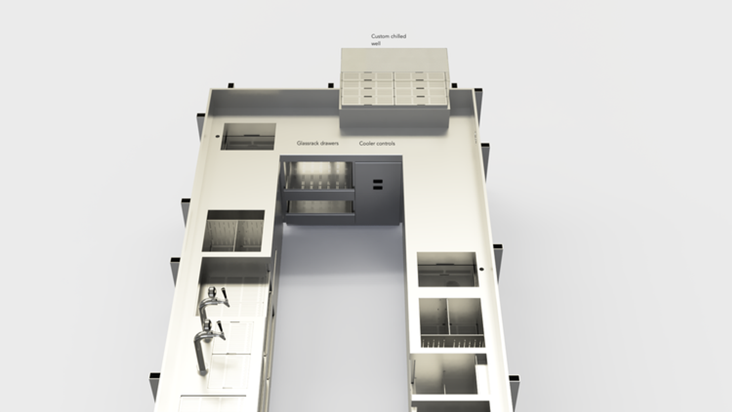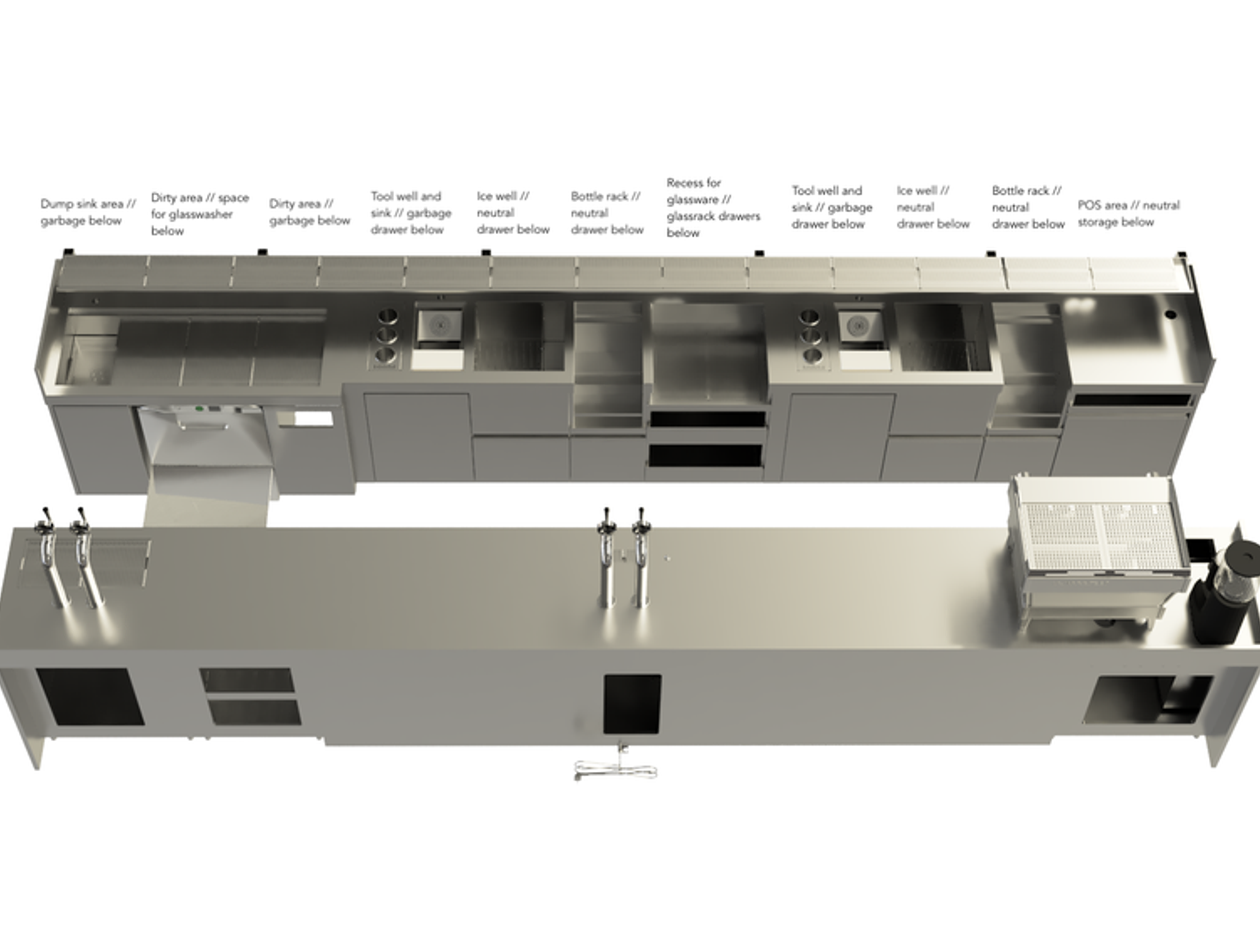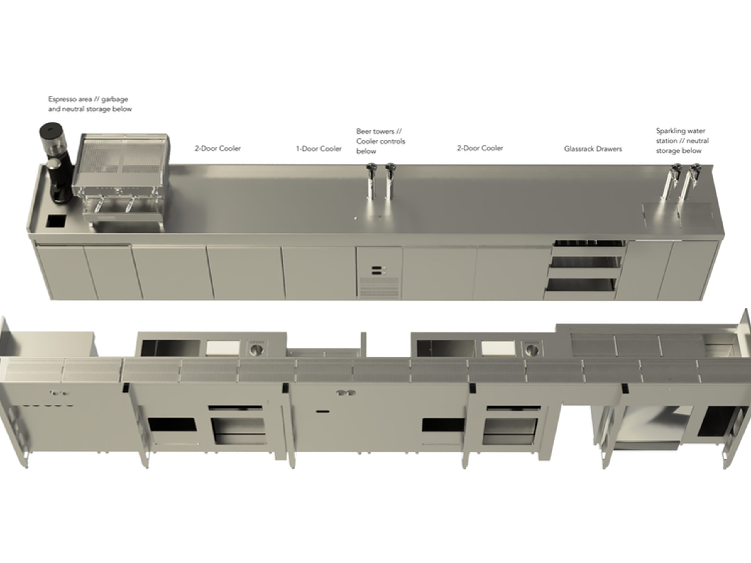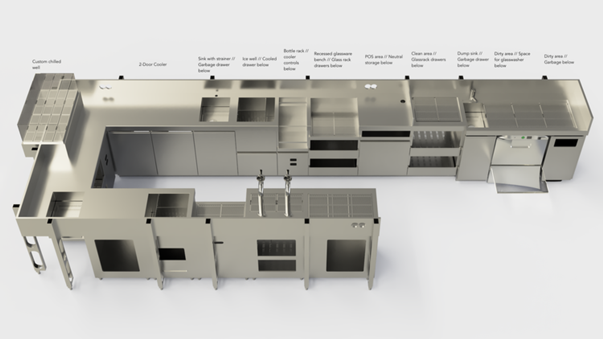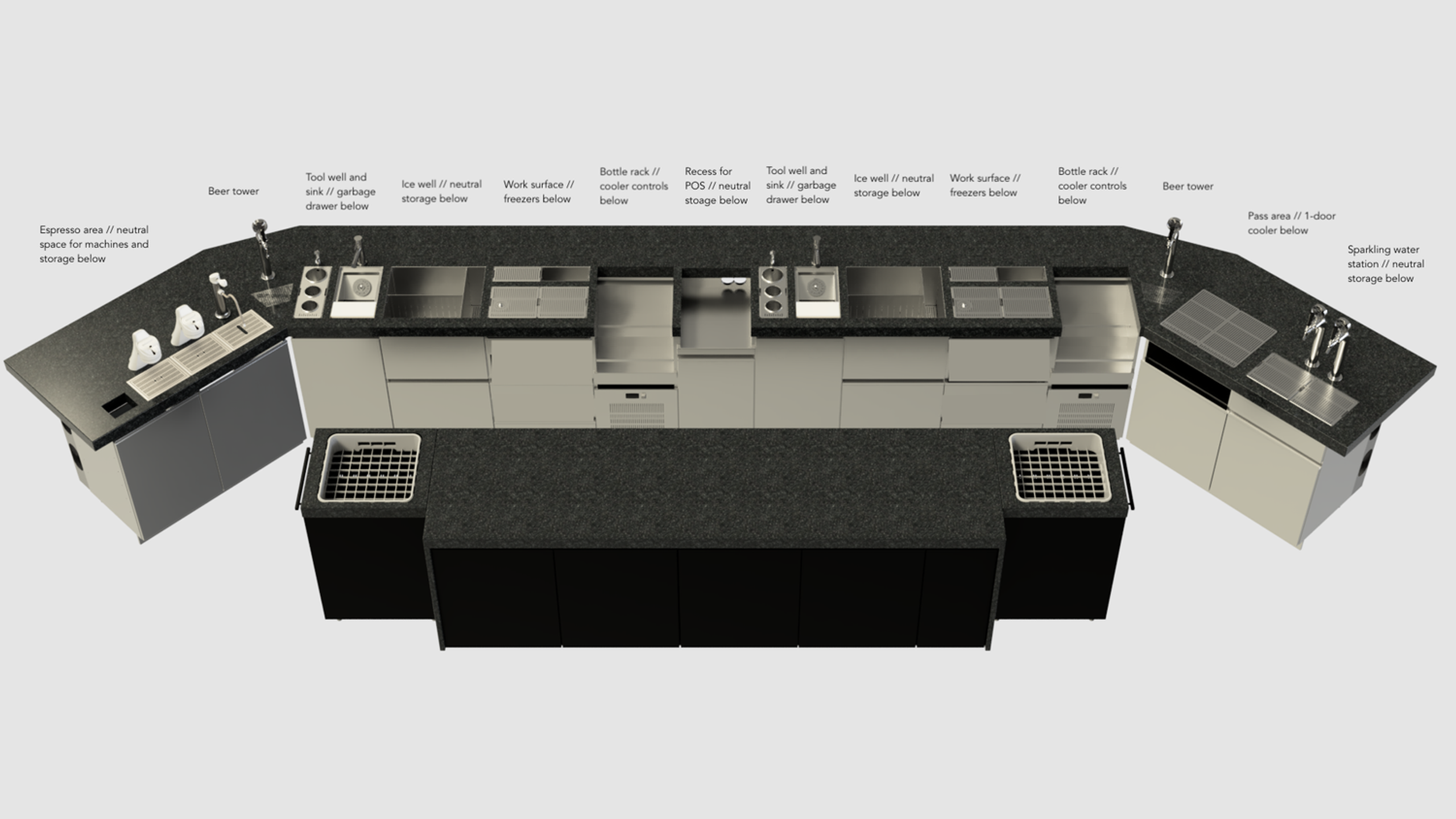 Serving a large brasserie-style restaurant, this bar needed to be versatile and efficient. The back bar features a comprehensive coffee station, ample cooling, and an integrated ice well for feature wines. It also includes a water station for bartenders and floor staff, with a custom chilled well to keep prepped bottles of water cool for the tables. Along the front bar, there’s a glass wash station and two fully stacked Leon stations, ready for whatever the evening brings for the bartenders.