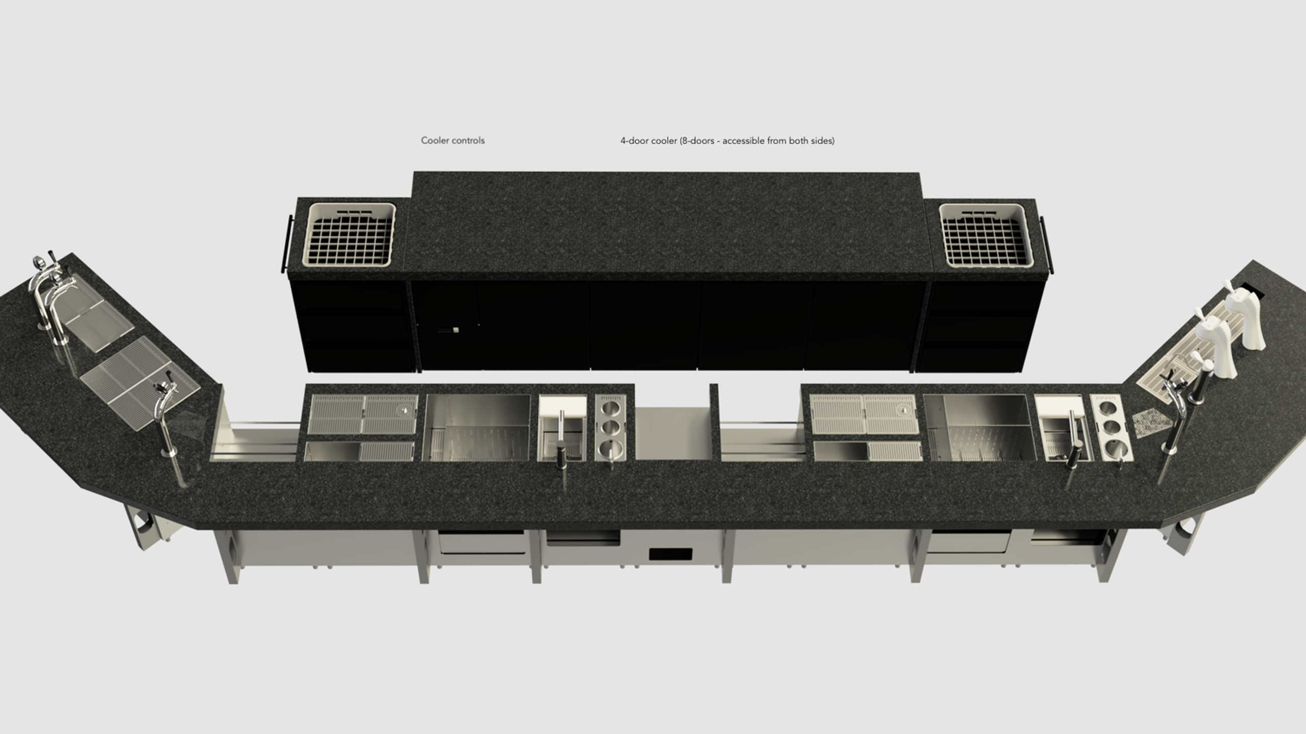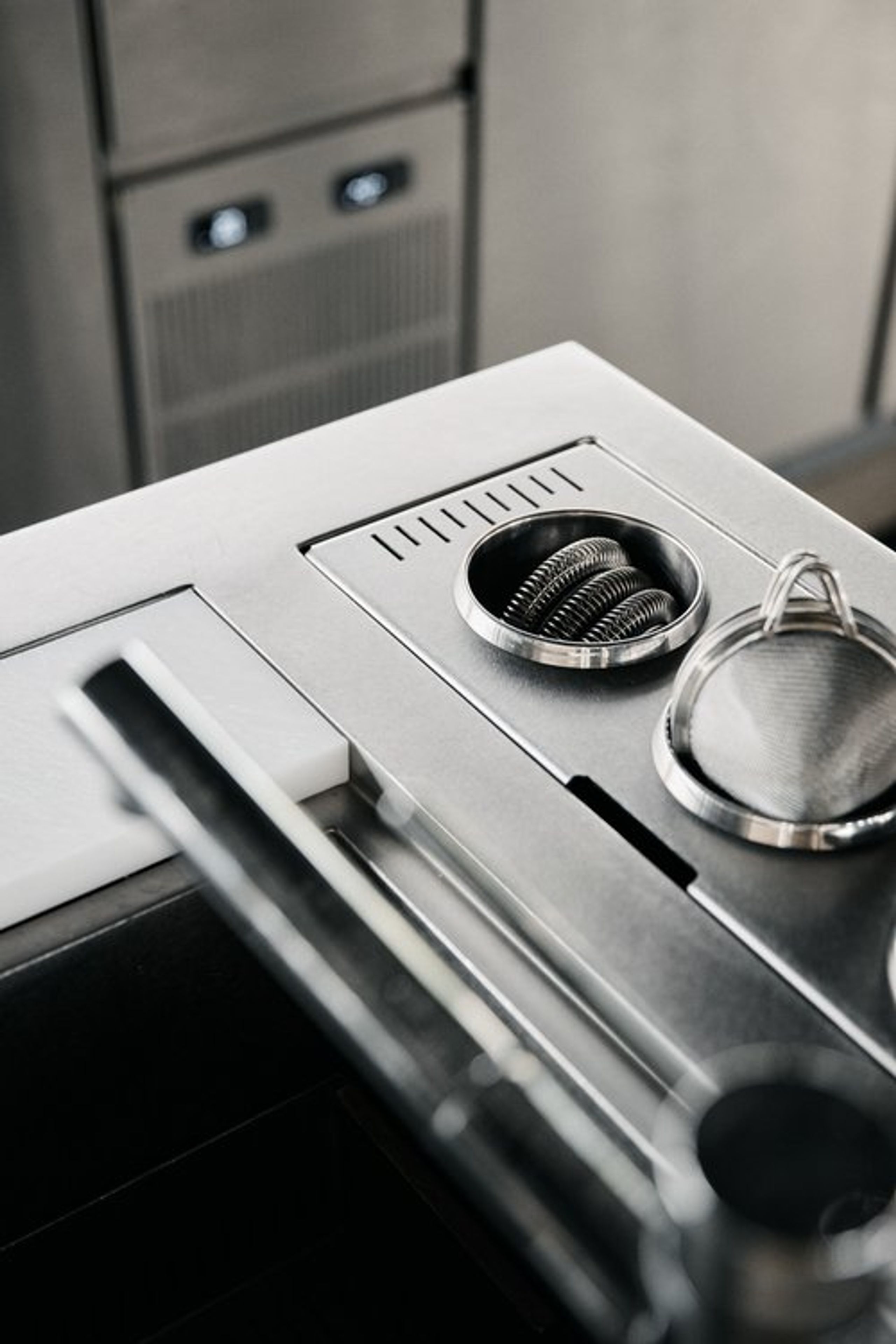 Wine and a kitchen! This bar embraces an open-concept design while still providing staff with some privacy through a classic Leon setup. Meant to feel spacious and inviting, Behind Bars delivered a streamlined bar solution to support the wine bar’s intensive menu. We also collaborated with kitchen suppliers to extend our custom brushed stainless steel fronts along the bar and seamlessly around the adjacent kitchen area.