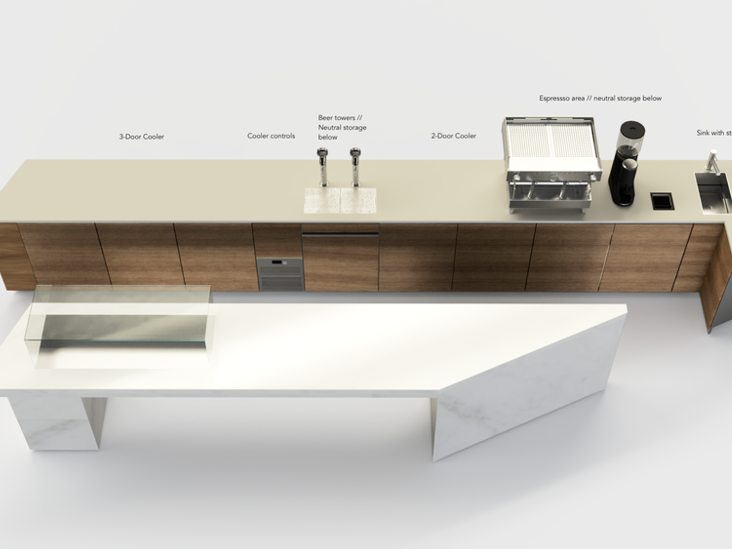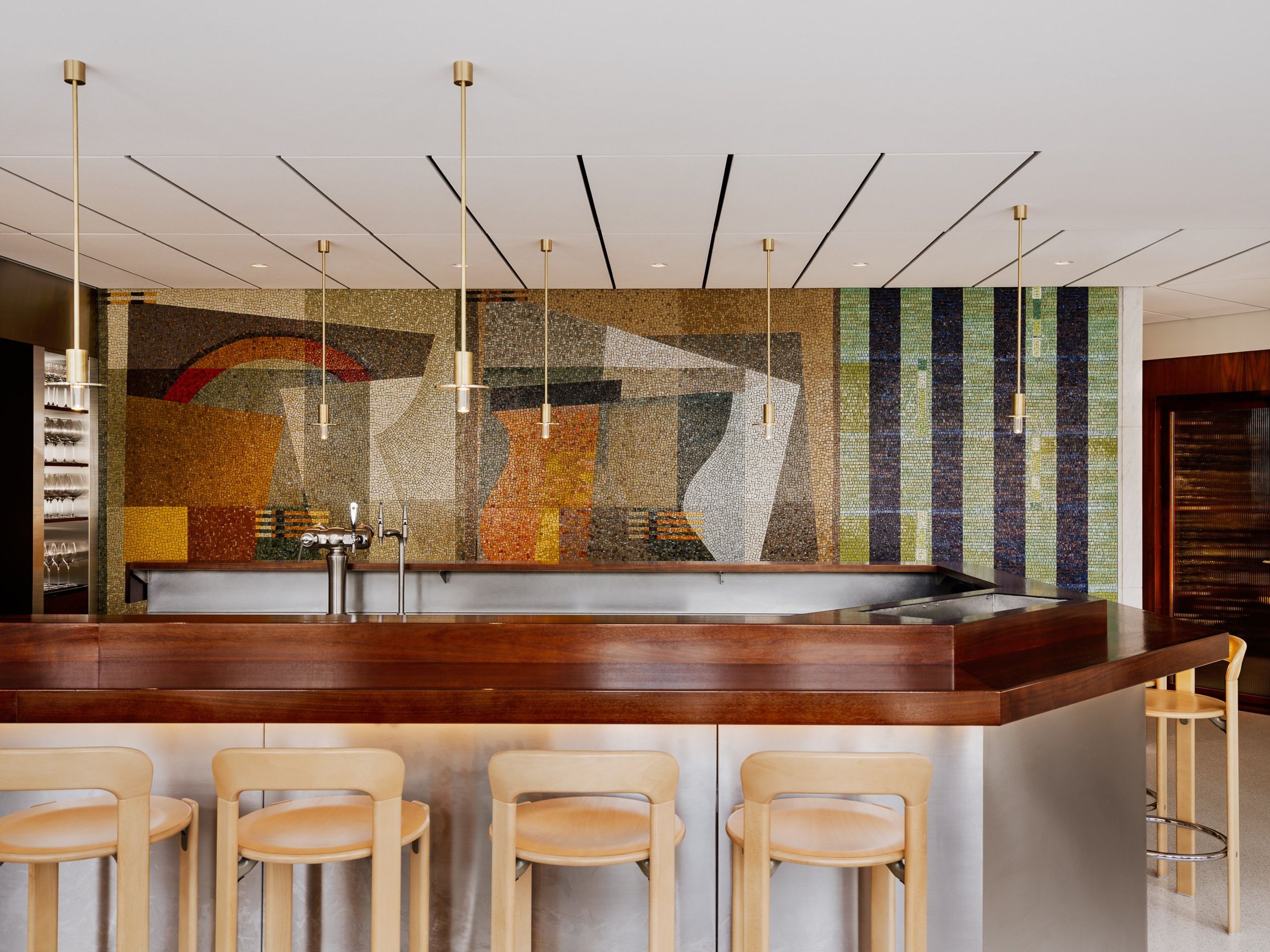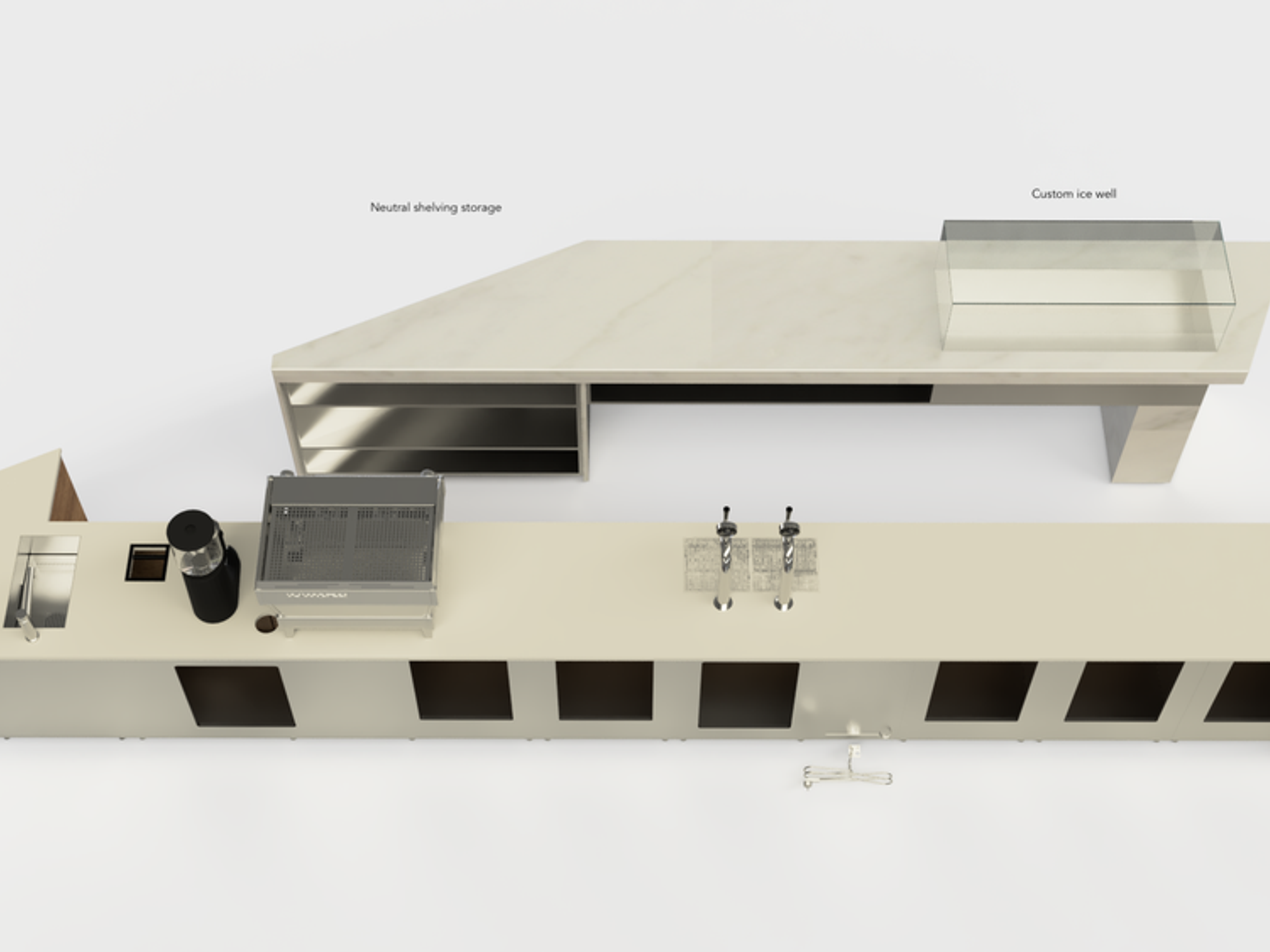 The Coffee Bar will be the welcoming feature of the first floor, ready to serve coffee to early morning commuters and then transform to offer bubbles and snacks for after-work guests. Behind Bars designed a functional back bar with ample cooling, a draft system, and a fully equipped coffee setup. BB worked closely with Ambassaden’s specialty carpenter to customize the back bar fronts, ensuring they complement the surrounding historically listed venue.