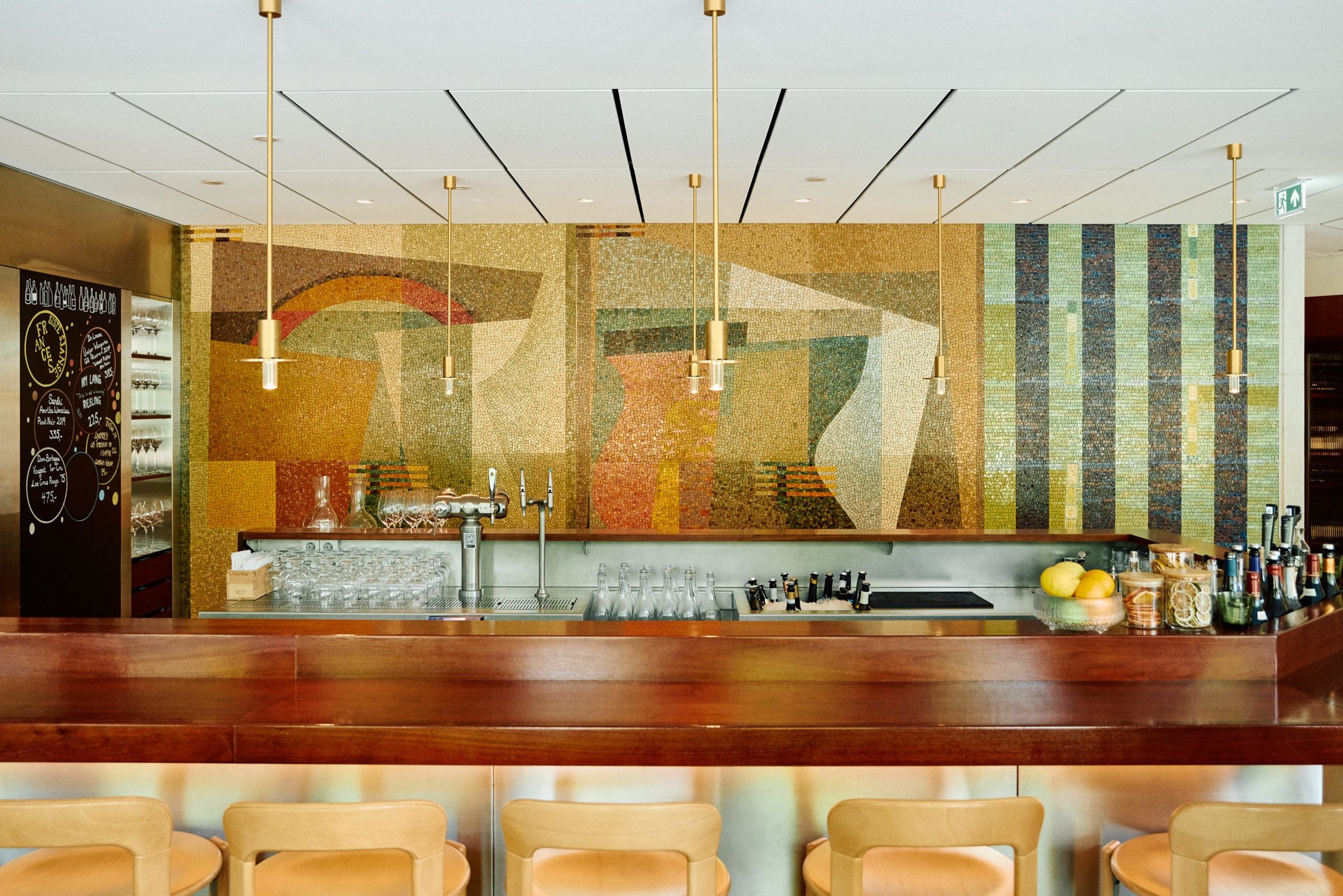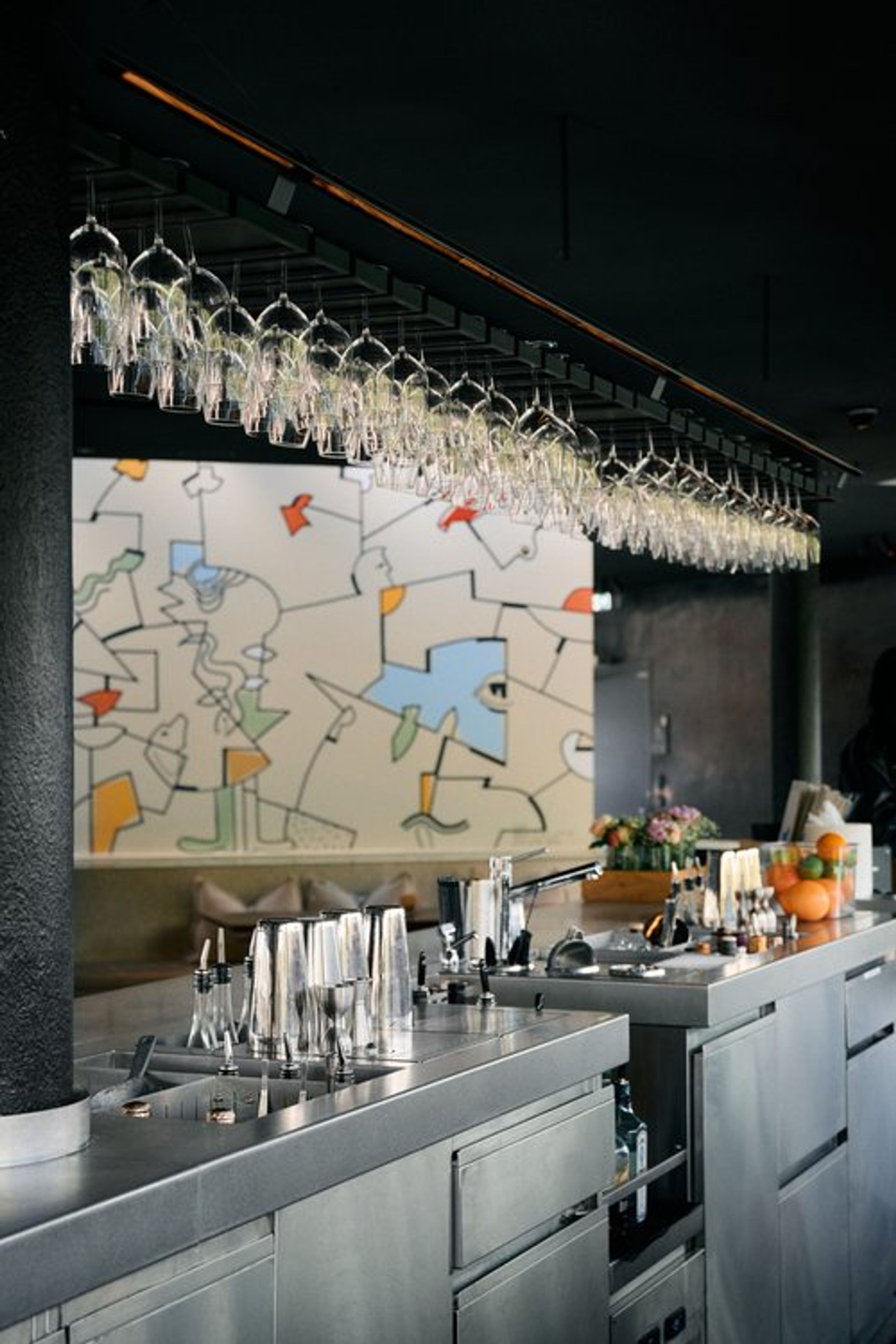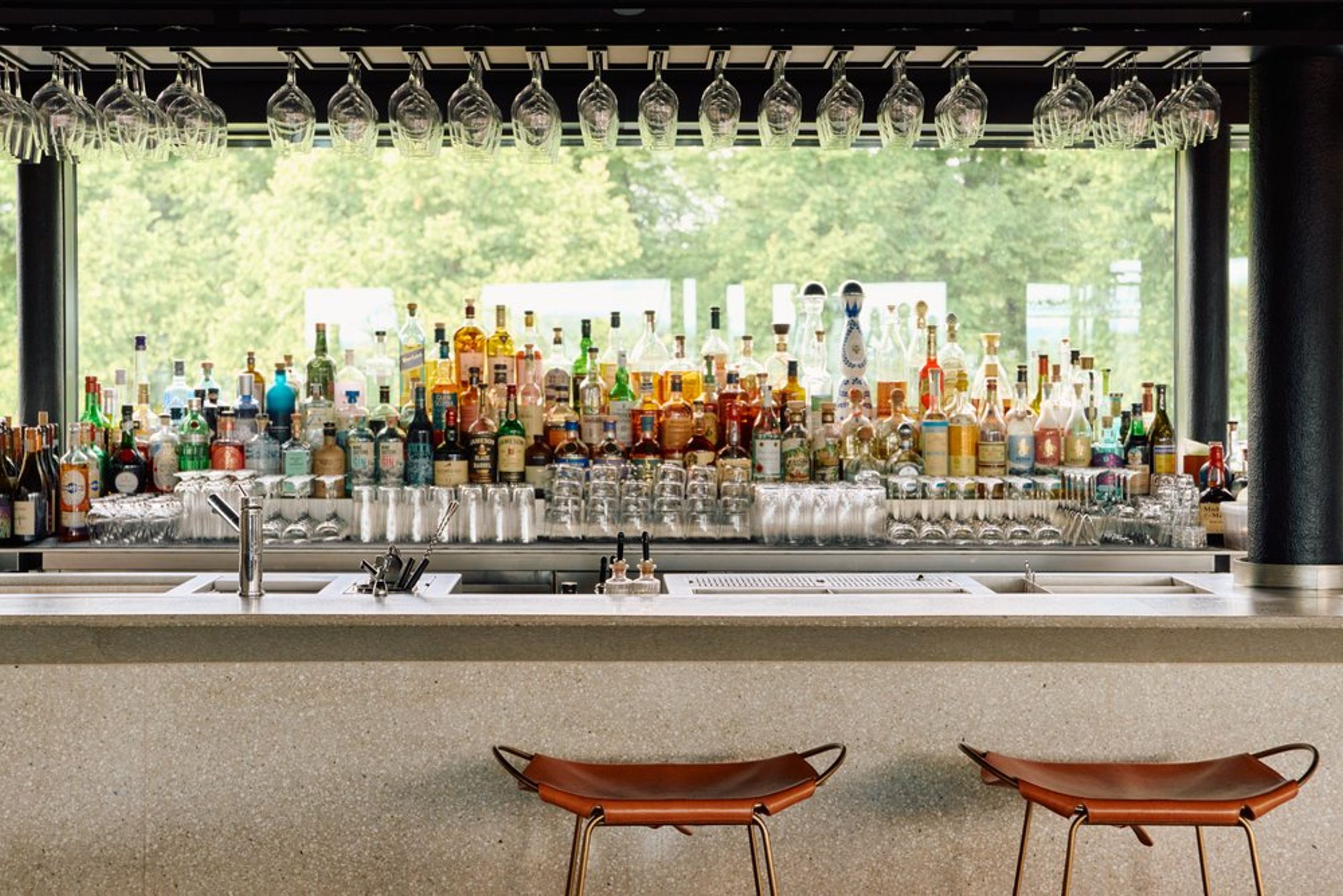 Starting from the top, the rooftop bar is all about after-work cocktails for the public but also needed to function as a lunch service spot for the people on the office floors below. Behind Bars delivered a smart Paloma solution that supports coffee and water drinkers during the day and quickly transforms into a sleek, flush cocktail bar in the evening, without obstructing the stunning view over the royal grounds.