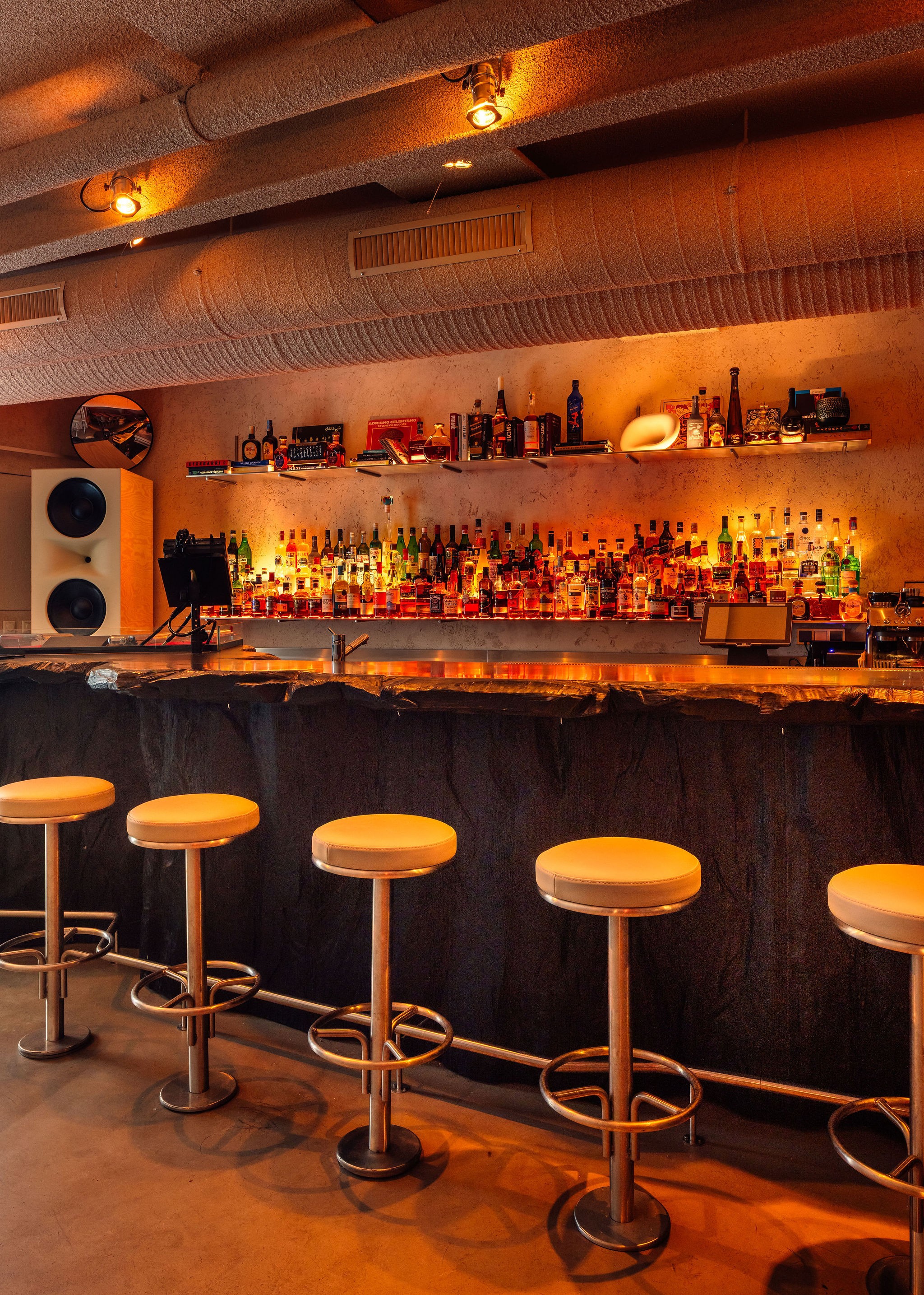 At BAZ, the bar merges with the open kitchen in full view. No curtain, no separation, only one shared workspace where cooks, bartenders and guests interact in real time. It gives the room a quiet theatricality: knives moving, shakers snapping, burners lighting, vinyl spinning. The energy builds with the people in the room.