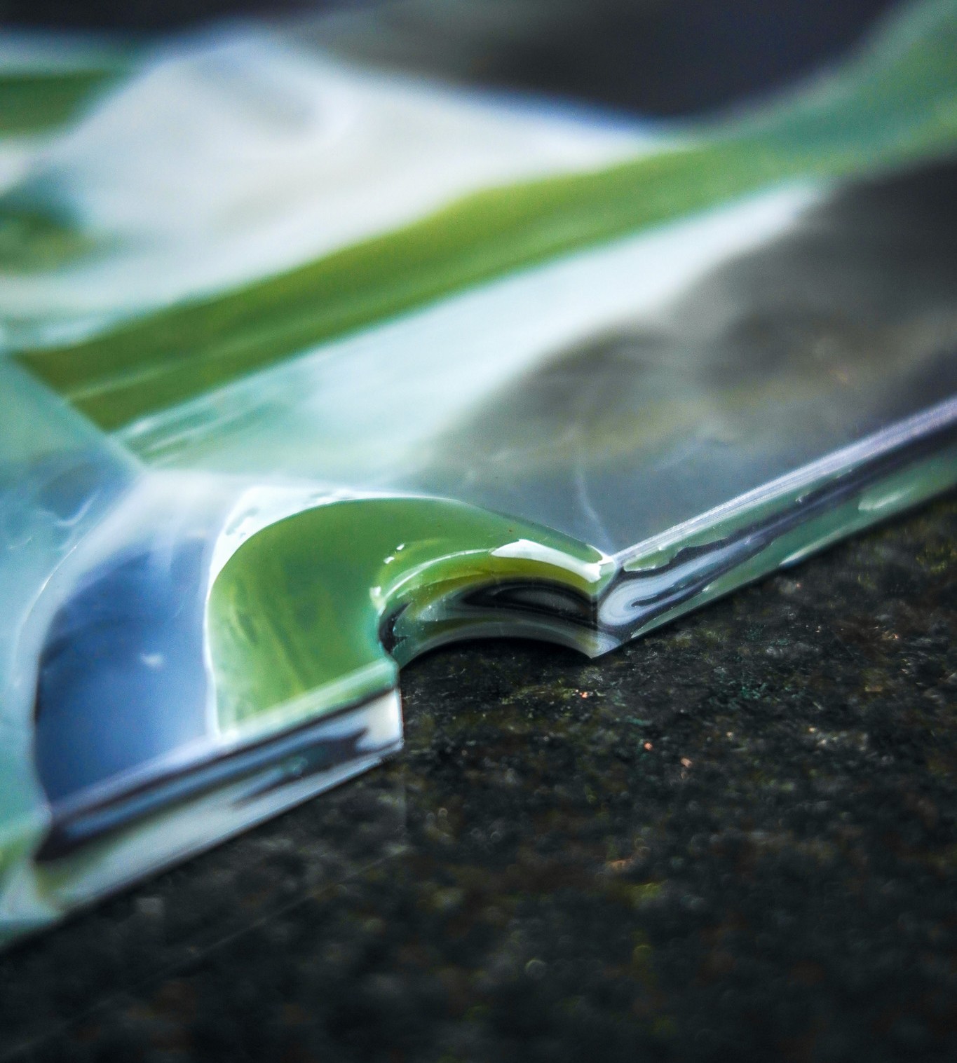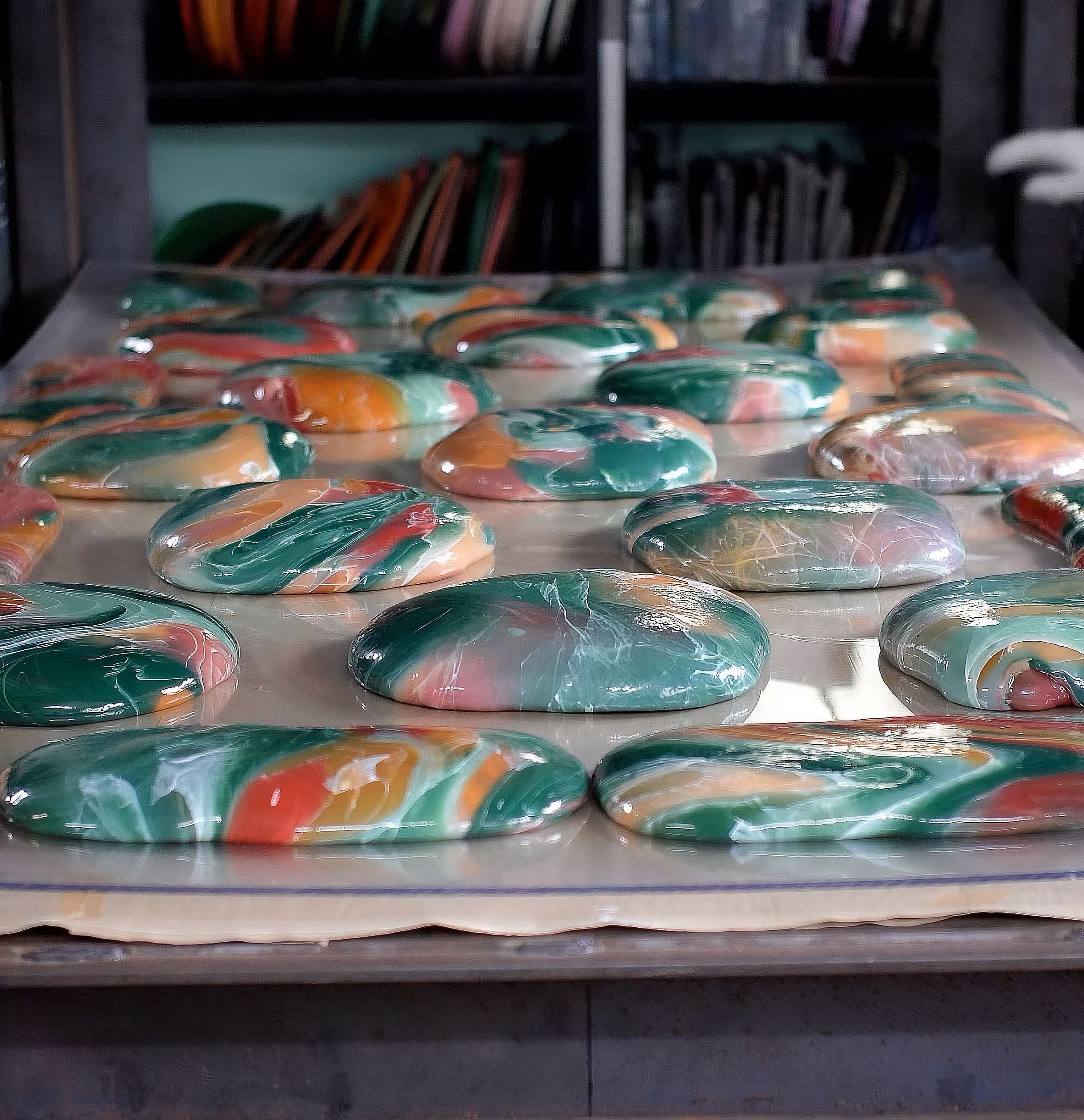 The material itself is built through layers. Most of the plastic they work with is clear, forming a translucent base. Colour is introduced sparingly, using fragments of coloured plastic to create depth without losing that sense of clarity. The marbled effect comes from cutting, rearranging, and recomposing these layers by hand before the material is compressed into sheets, CNC cut, and finished.